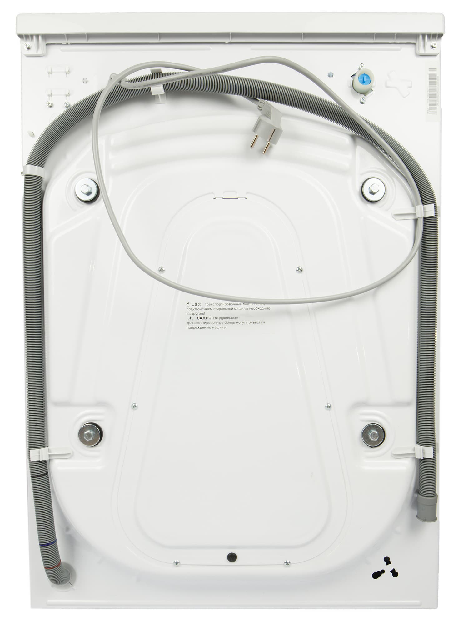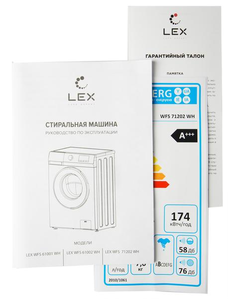 В верхней части задней панели расположена розетка для подключения заливного шланга со съемным пластиковым фильтром, защищающим машину от ржавчины и загрязнений из водопровода. Lex WFS 71202 WH подключается только к холодному водоснабжению. Гофрированный сливной шланг у этой модели несъемный, традиционной конструкции.