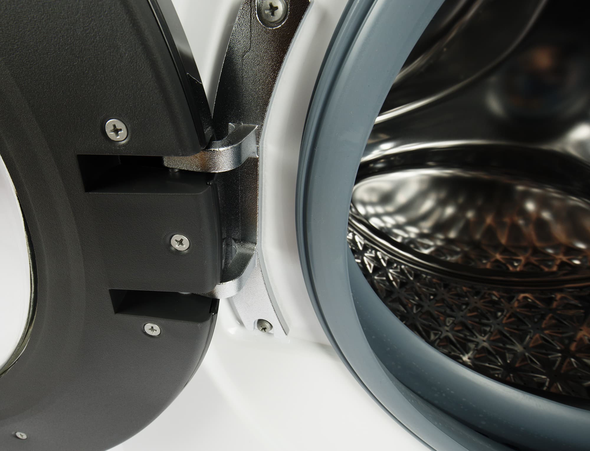 Петли люка у этой модели металлические, их конструкция позволяет распахнуть дверцу чуть больше, чем на 180°. Из металла сделан и фиксатор замка, а ответная часть защелки — пластиковая. Переставить крышку на правостороннее открывание в этой модели нет возможности.