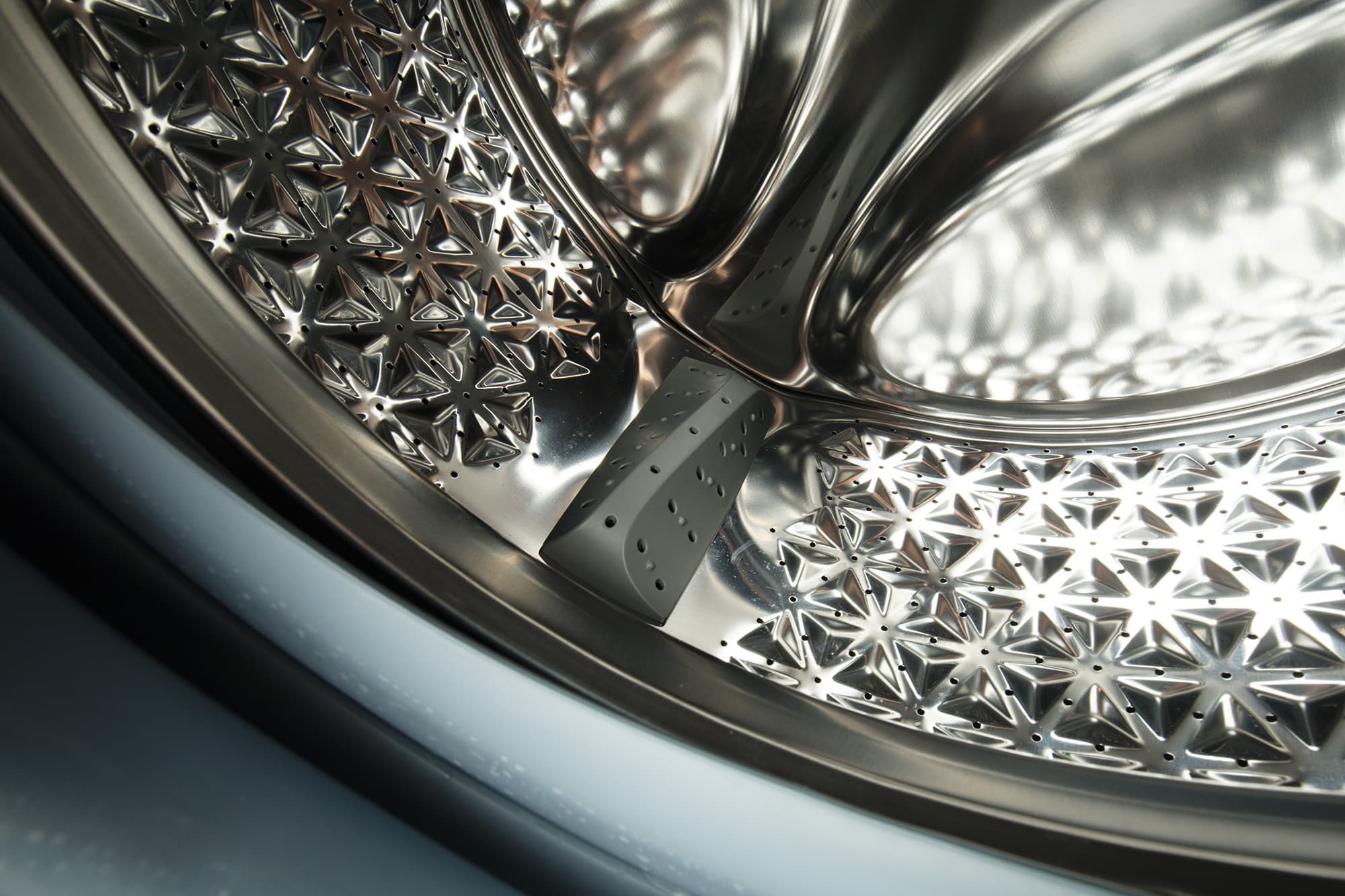 На стенках барабана — перфорация и выштамповки в виде выпуклых треугольников, образующих красивый узор. Серые пластиковые бойники слегка изогнуты и также «в дырочку».