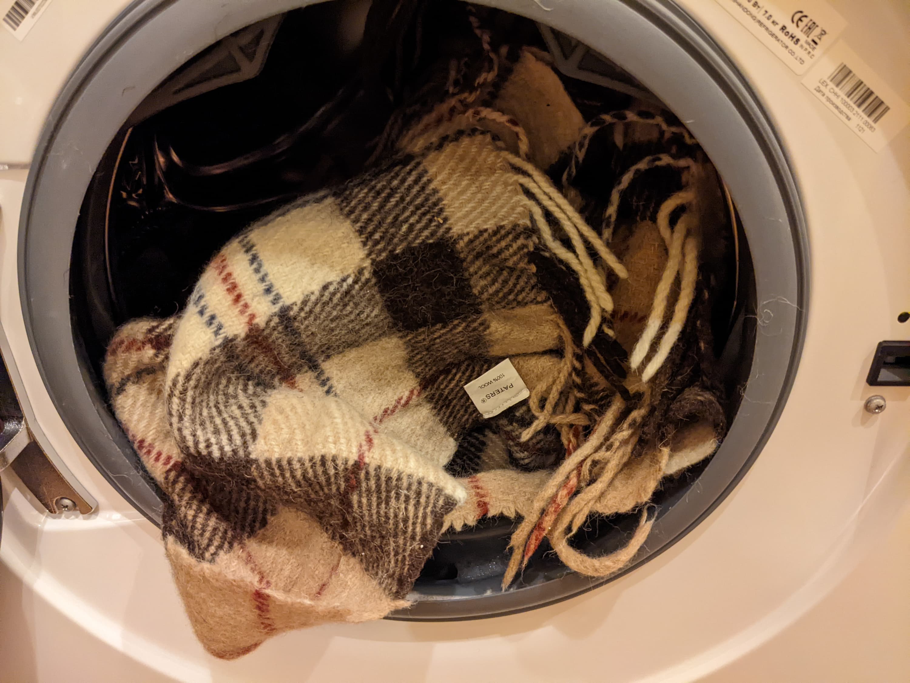 Стиркой только хлопка современной машине не обойтись. Поэтому мы должны оценить и то, как нежно эта модель обработает деликатные ткани. Мы положили в нее наш любимый шерстяной плед весом чуть меньше килограмма и поставили соответствующую программу с установками по умолчанию (40 °C, отжим 600 оборотов в минуту). В ход пошло специальное жидкое средство для шерсти.