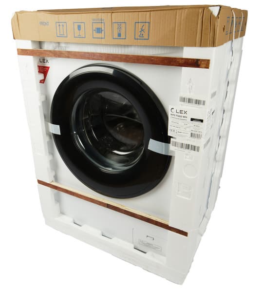 Пенопластовая технологическая упаковка Lex WFS 71202 WH усилена с лицевой стороны двумя деревянными брусками, защищена сверху картонной крышкой с транспортировочной информацией и обтянута толстой полиэтиленовой пленкой.