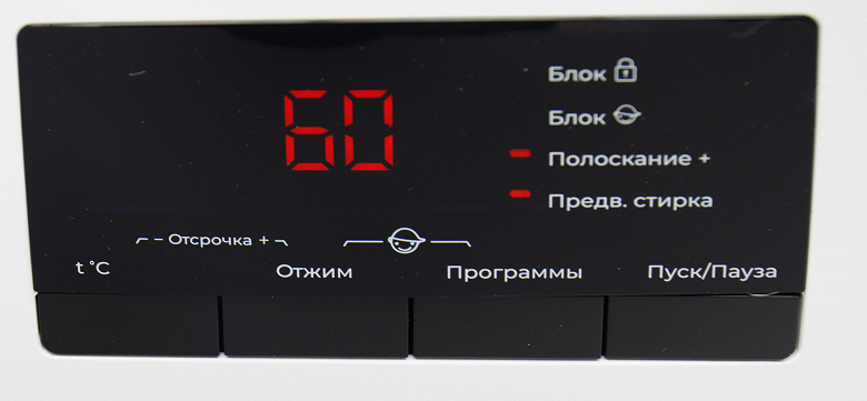 Длинное нажатие на кнопки отжима и программы включает и отключает режим блокировки от детей. Индикатор включенной защиты находится под лампочкой блокировки барабана, оба светодиода подписаны одинаково — «Блок», но отличаются мелкими пиктограммами.