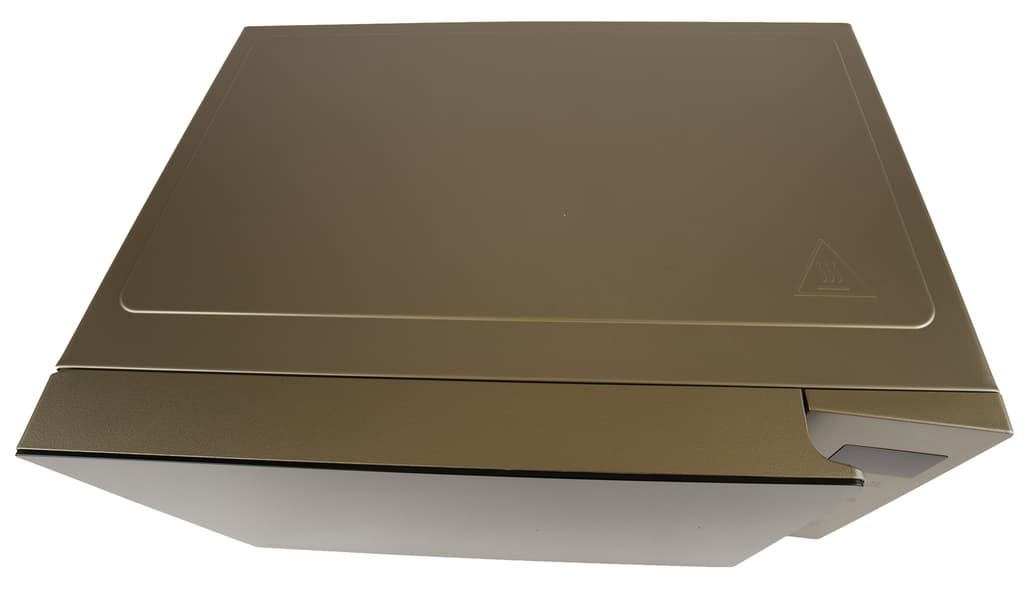 Образ у LG MW25R35GISH элегантно-сдержанный. Корпус цвета «подсохший мокрый асфальт» не перегружен декором, более того — он лишен ручки. Дизайнеры LG освободили зону захвата, расположив панель управления под небольшим углом к плоскости дверцы. Когда печь находится в режиме ожидания, дверца кажется совершенно черной и зеркальной, но при включении прибора в ней обнаруживается затемненное смотровое окошко. Глянцевая дверь выглядит стильно, но требует постоянного ухода, иначе быстро покроется отпечатками пальцев.