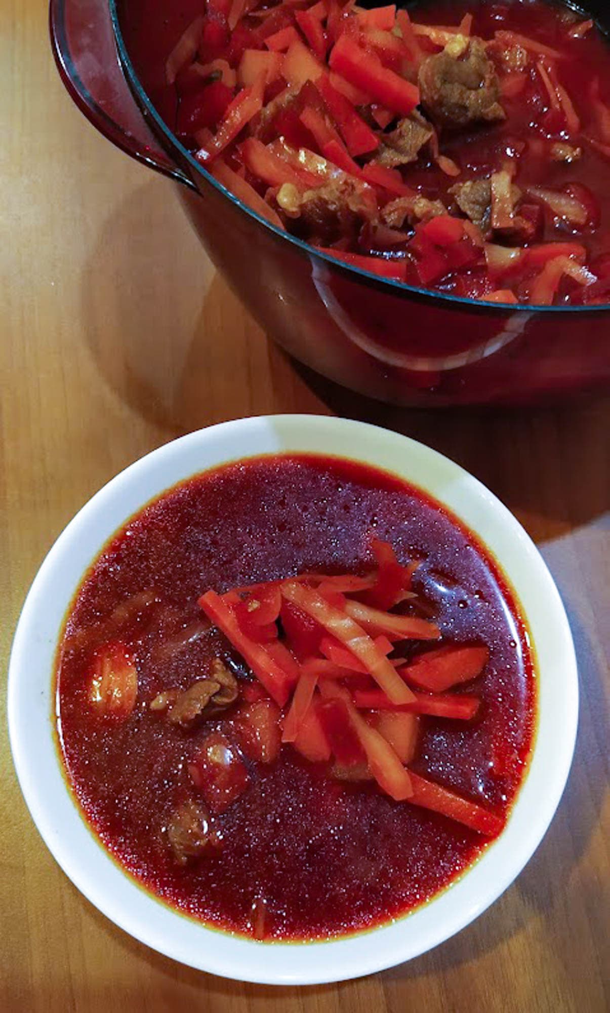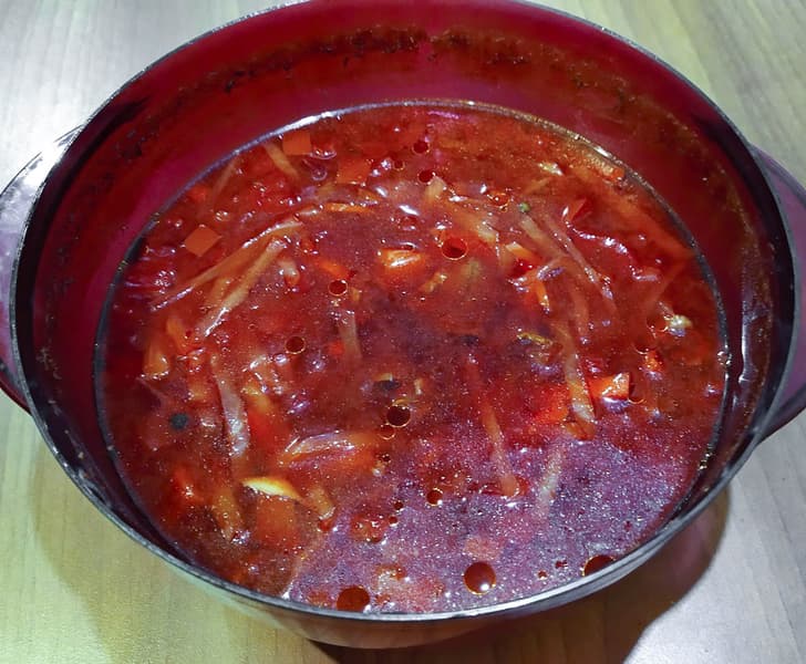 Наконец нас все устраивает: свекла готова, а капуста слегка-слегка хрустит — идеально. Что ж, конечно, это не ресторанный и уж тем более не наш домашний борщ, а вполне себе столовский — но из не самой затрапезной столовой. Хорошо, что мы положили ароматных сушеных трав — они восполнили отсутствие вкуса корнеплодов, миновавших этап пассерования в масле. И чеснока жалеть не стоит, одного зубчика нам показалось катастрофически мало.