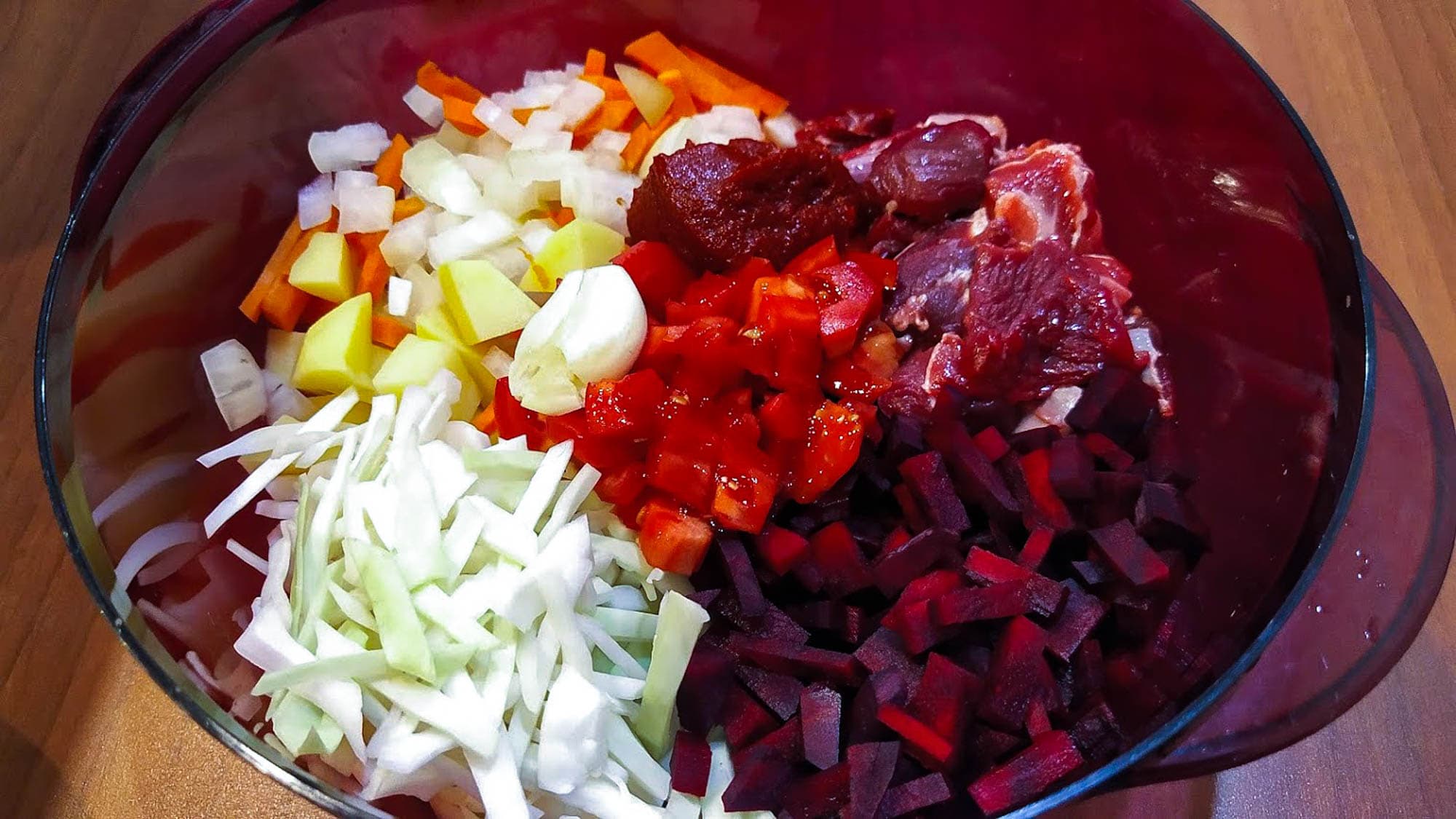 Уберите детей от экранов, сейчас мы будем баловаться с едой! (Иначе приготовление борща по рецепту LG не назовешь.) Итак, четко следуя разделу «Популярное меню» инструкции, мы нарезали 300 г мяса, полкартофелины, полсвеклы, полморковины, 100 г капусты, 1 помидор. Добавили к этому столовую ложку томатной пасты, раздавленный зубчик чеснока, соль и перец. Но некоторые отступления мы все-таки допустили: вместо свежей зелени положили сушеные травы и не стали вливать ложку уксуса — на кислоту лучше выправим в конце. И так нас, кажется, ждет нечто странное, не хватало еще, чтобы в нем плавала твердая картошка.
