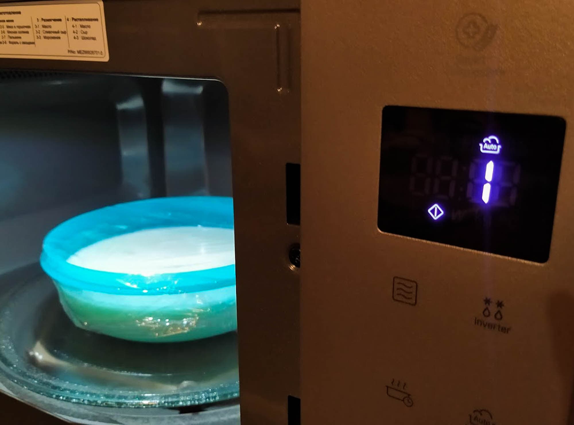 Это испытание для микроволновой печи давно прижилось в нашей лаборатории. 800 г смешанного фарша мы поместили в микроволновку и запустили режим «Инверторная разморозка». Прибор решил, что ему понадобится 13 минут 24 секунды — заметно меньше, чем мы привыкли.