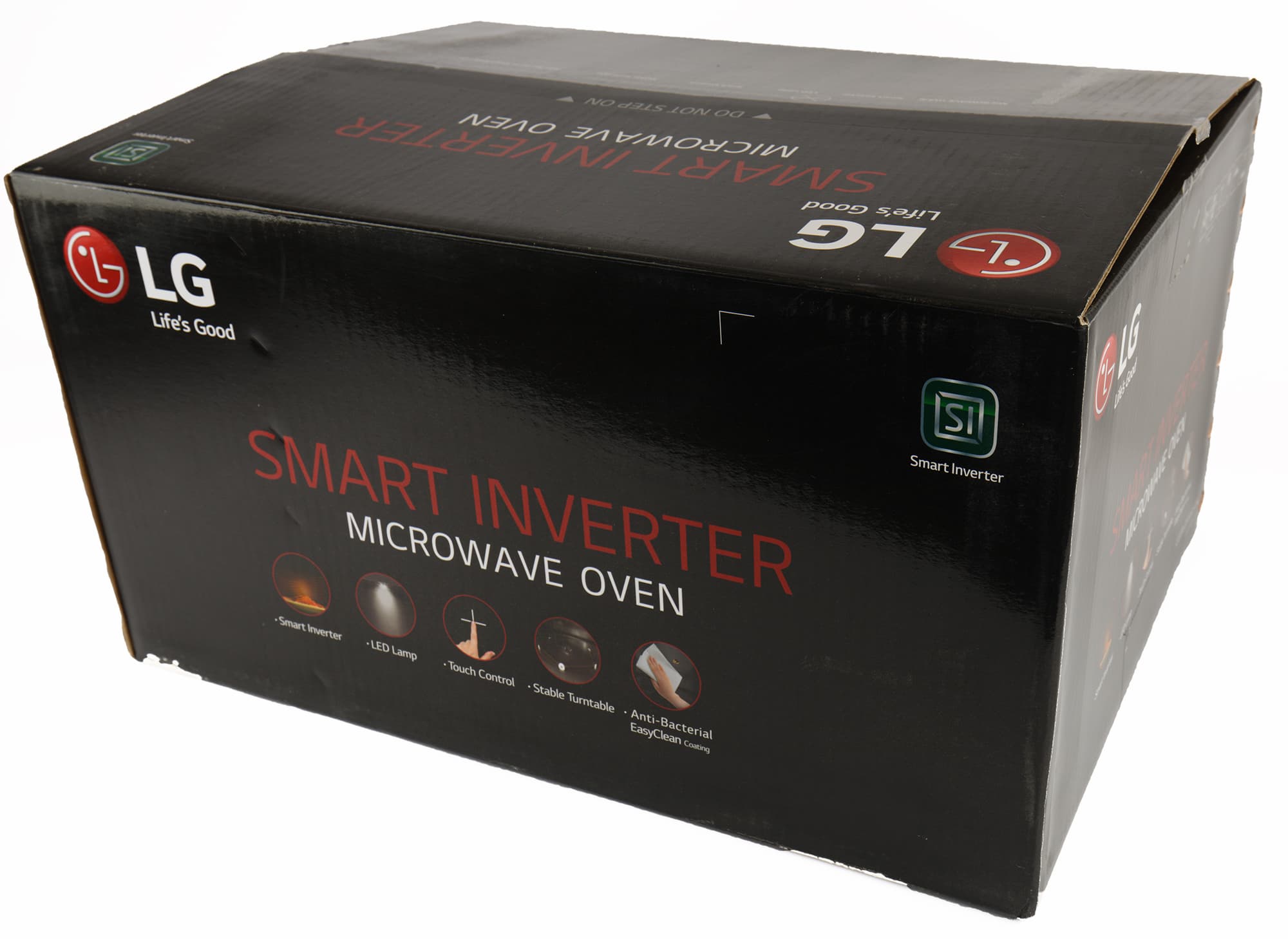 Коробку, в которой к нам прибыла LG MW25R35GISH не назвать супер-информативной: изображения прибора нет, как и бросающегося в глаза названия модели, преимущества печи перечислены по-английски: «умный» инвертор, что бы это ни значило, LED-подсветка, сенсорное управление, устойчивый поворотный столик, антибактериальное покрытие камеры Easy Clean.