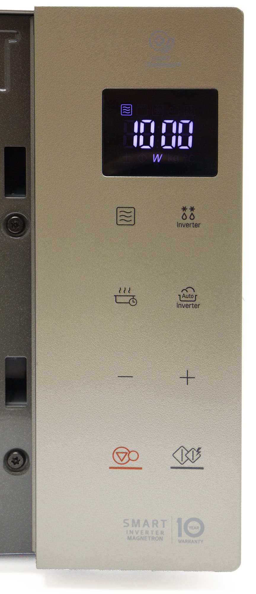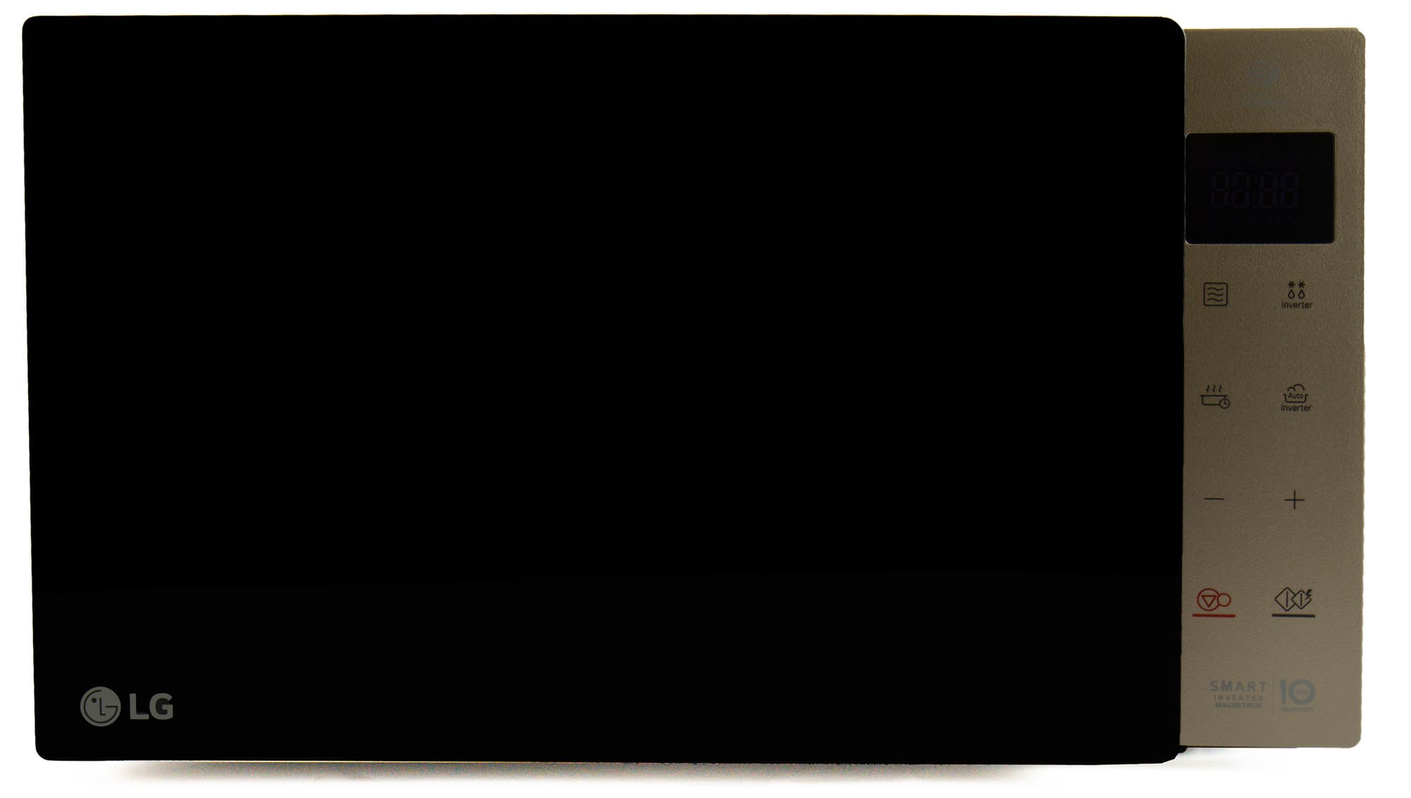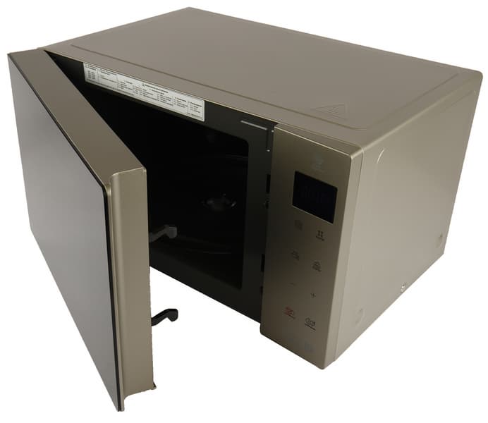 А вот к внешности и устройству LG MW25R35GISH у нас нет ни малейших претензий: элегантный дизайн печи отлично впишется в любой интерьер, а инвертор обеспечил прибору небольшой вес и вместительную камеру.