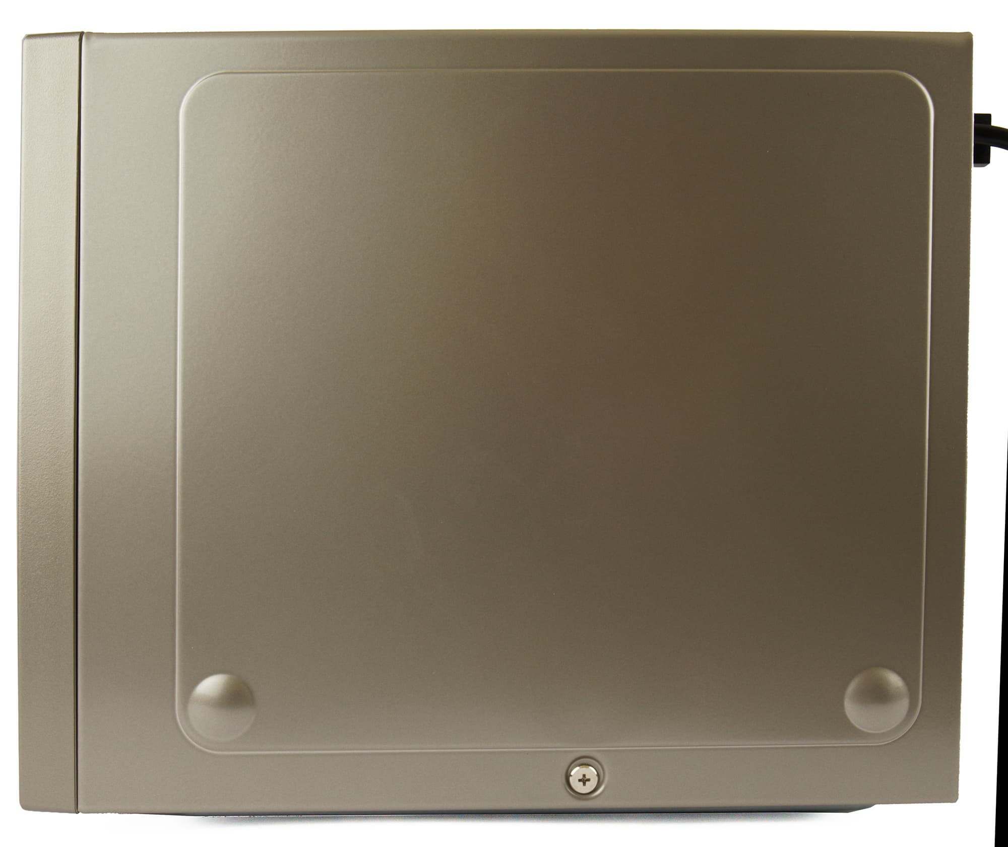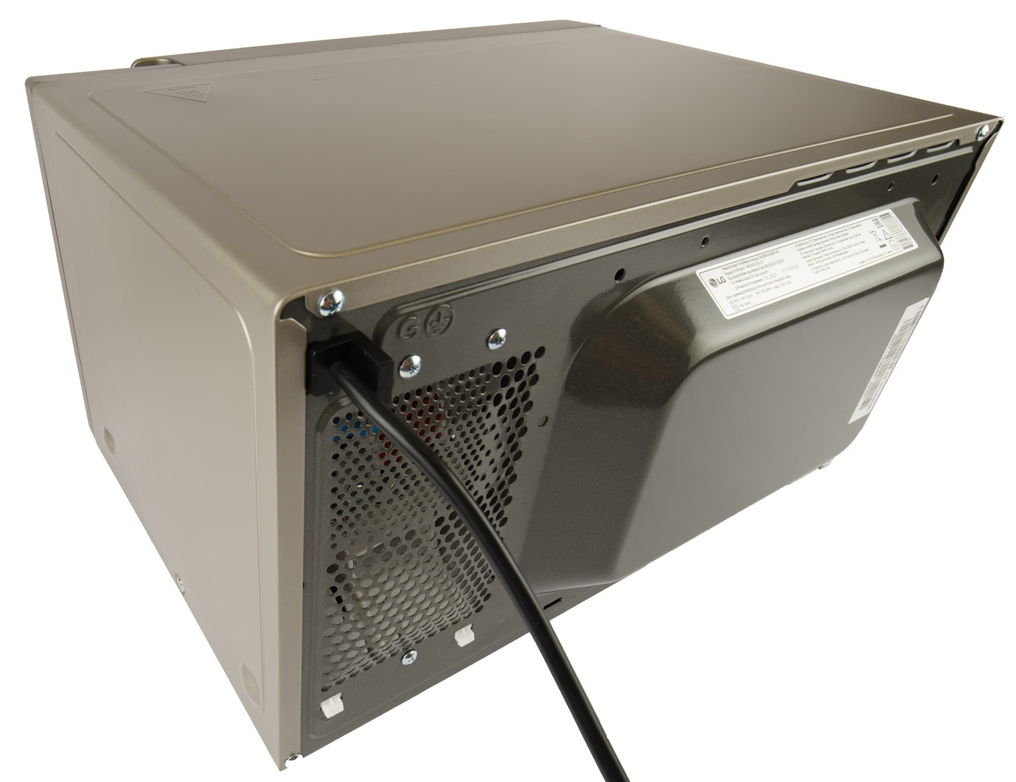 На тыльной стороне — дополнительные вентиляционные отверстия и наклейка с информацией о приборе. Электропровод выходит из левого верхнего угла задней панели, он защищен от перегиба ограничителем. Справа — предохранительный упор, не позволяющий придвинуть устройство слишком близко к стене и повредить его или поверхность.