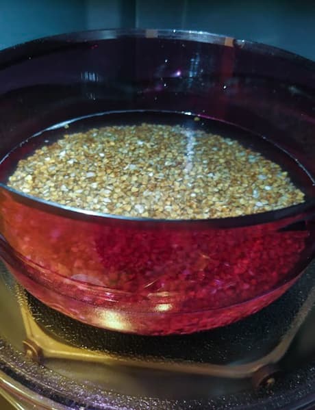 300 г промытой крупы залили 600 мл воды, добавили соль, накрыли емкость и отправили в печь (автоматическая программа 2-2). Установить вес нам не предложили, микроволновка отмерила себе 20 минут работы и запустилась.