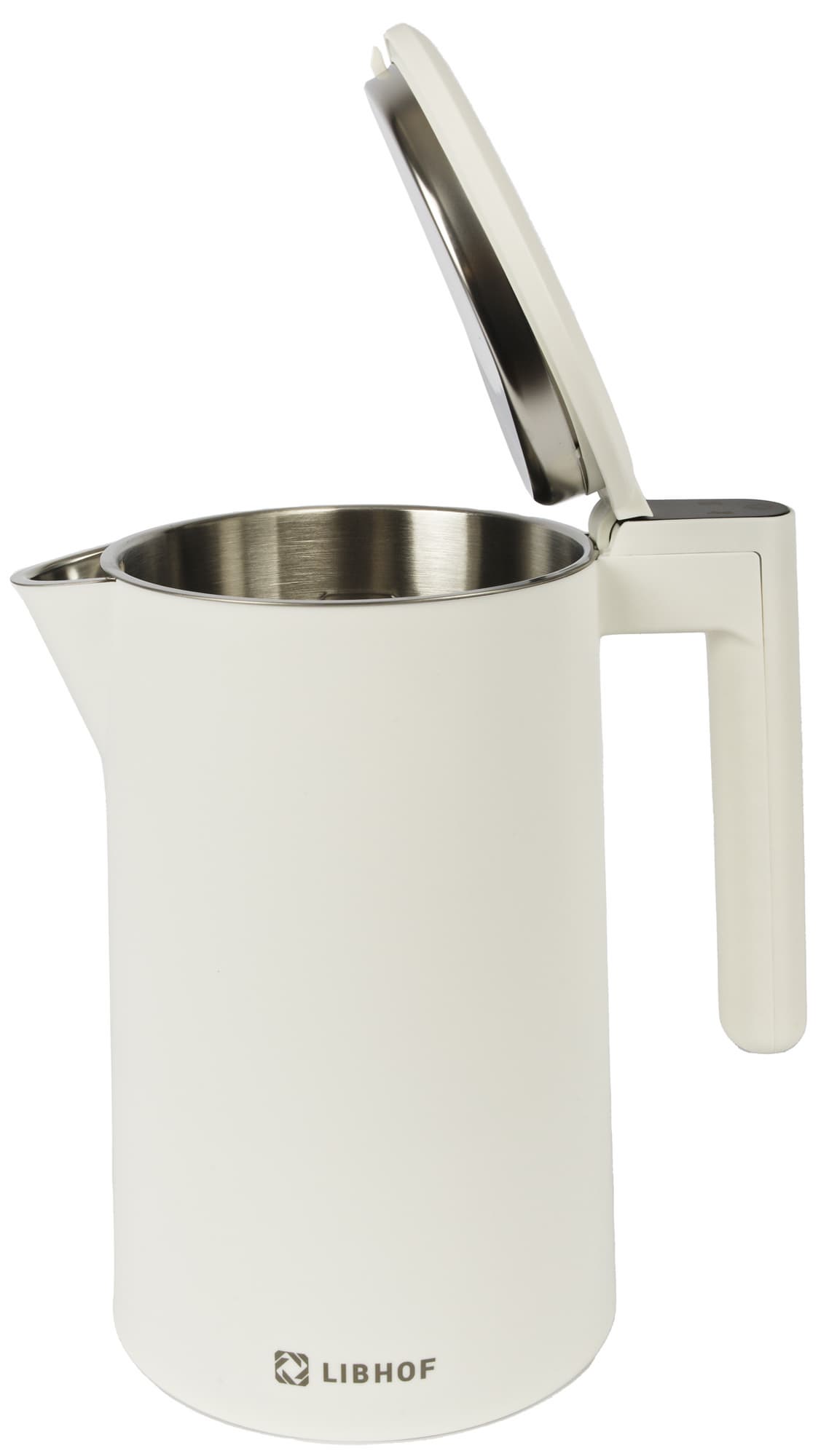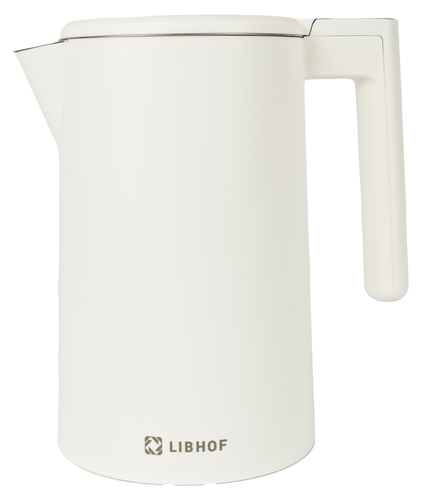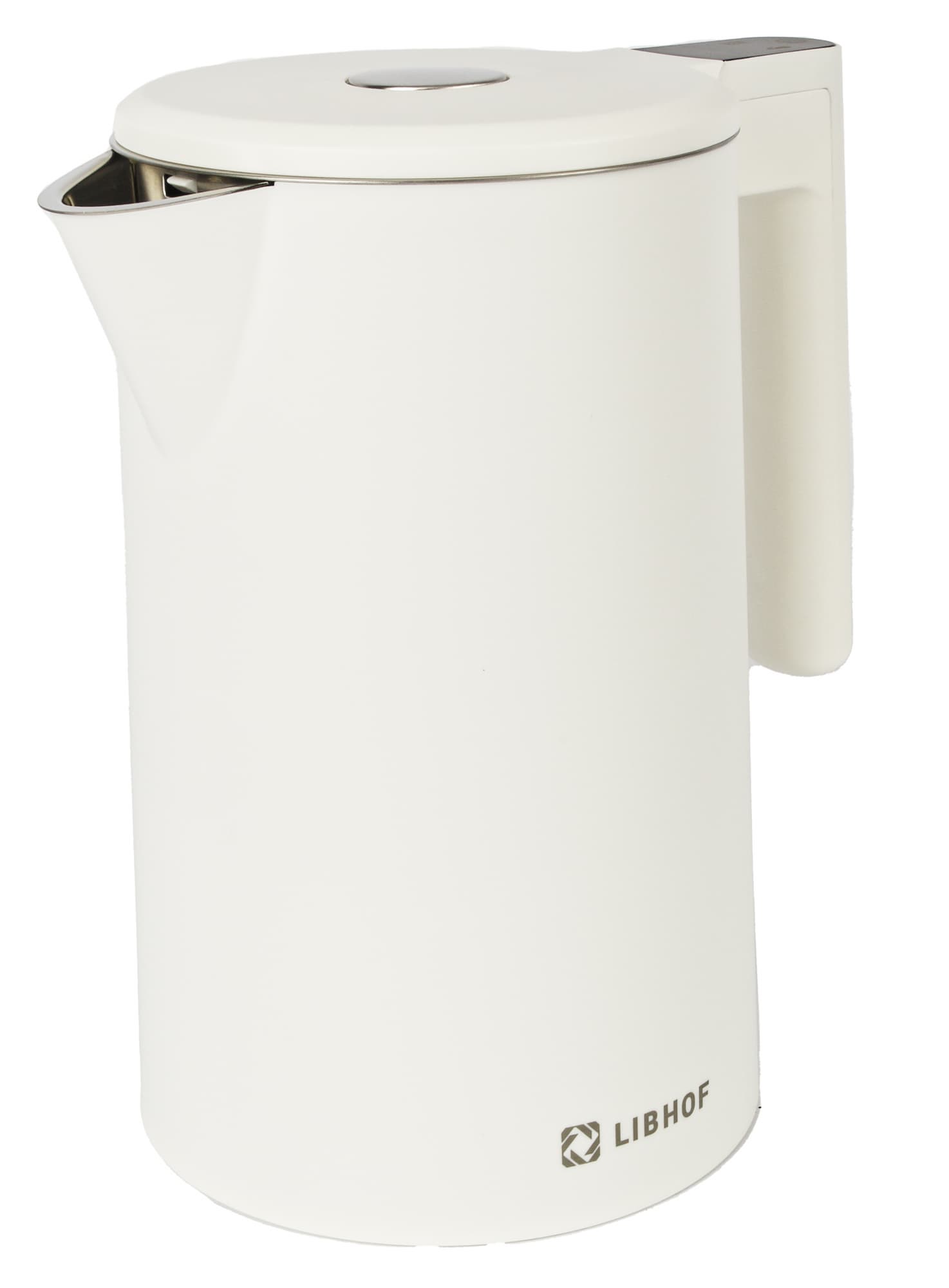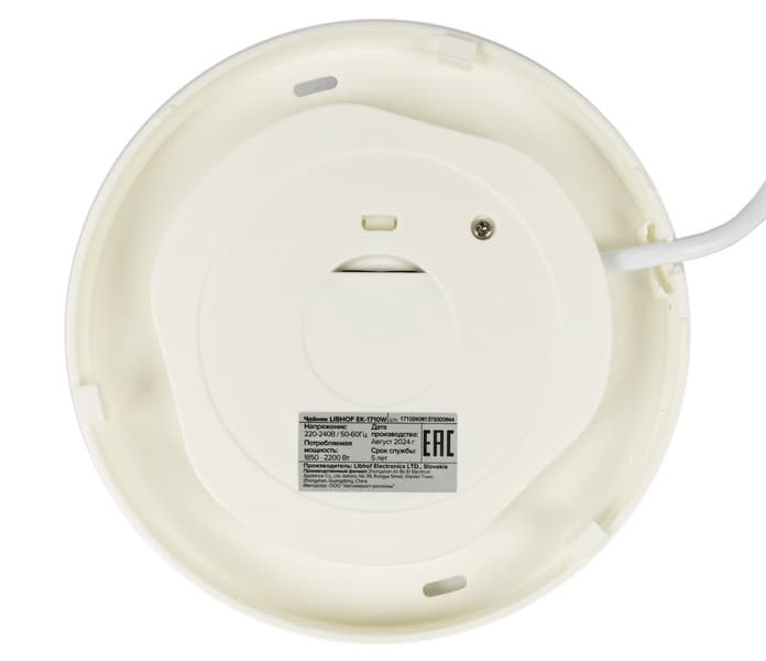 Чайник Libhof EK-1710 выглядит технологично и современно, вплоть до того, что разница между корпусом чайника и подставкой практически не видна — они сливаются по цвету. Сам корпус представляет собой правильный цилиндр, его внешняя поверхность сделана из матового белого пластика, приятного на ощупь.