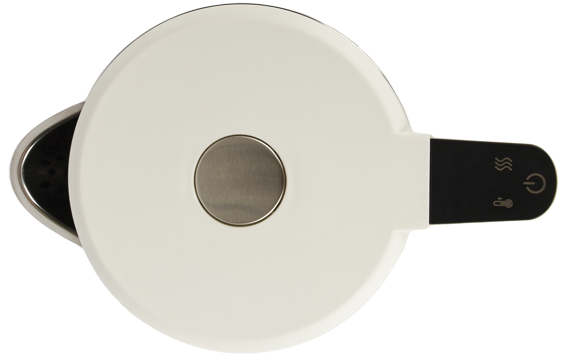 Большая кнопка по центру крышки чайника служит для ее открытия. Сверху на ручке расположены кнопки управления чайником: кнопка включения/выключения, кнопка выбора температурного режима и кнопка подогрева.