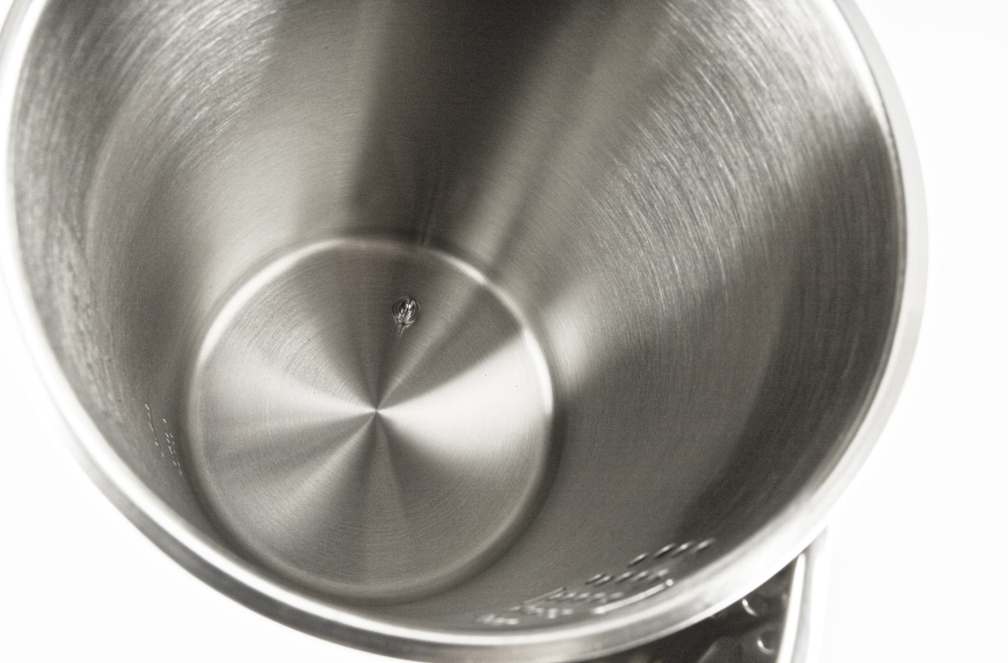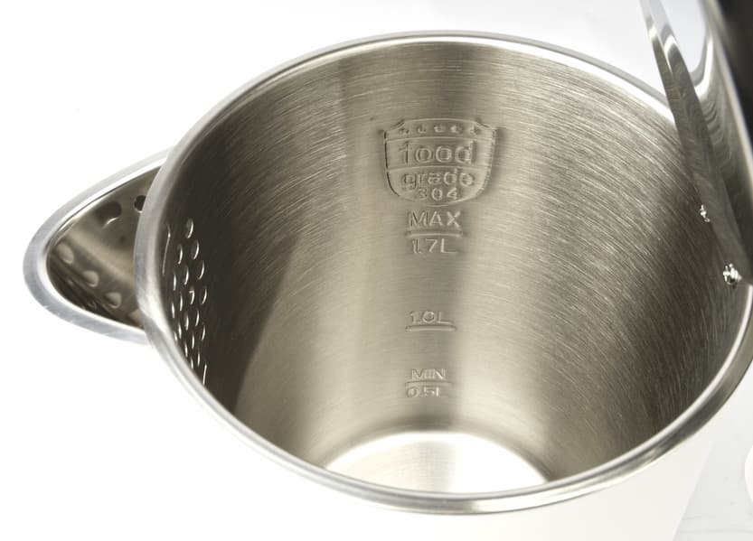 Индикатора уровня воды у чайника нет, но оценить объем можно, заглянув внутрь. На стальной внутренней поверхности есть разметка уровня воды: от минимального (0,5 л) до максимального (1,7 л). Это не так удобно, как окошко в корпусе, но мы, например, после некоторого опыта пользования чайником начинаем определять объем оставшейся внутри воды не по индикаторам, а по весу чайника.
