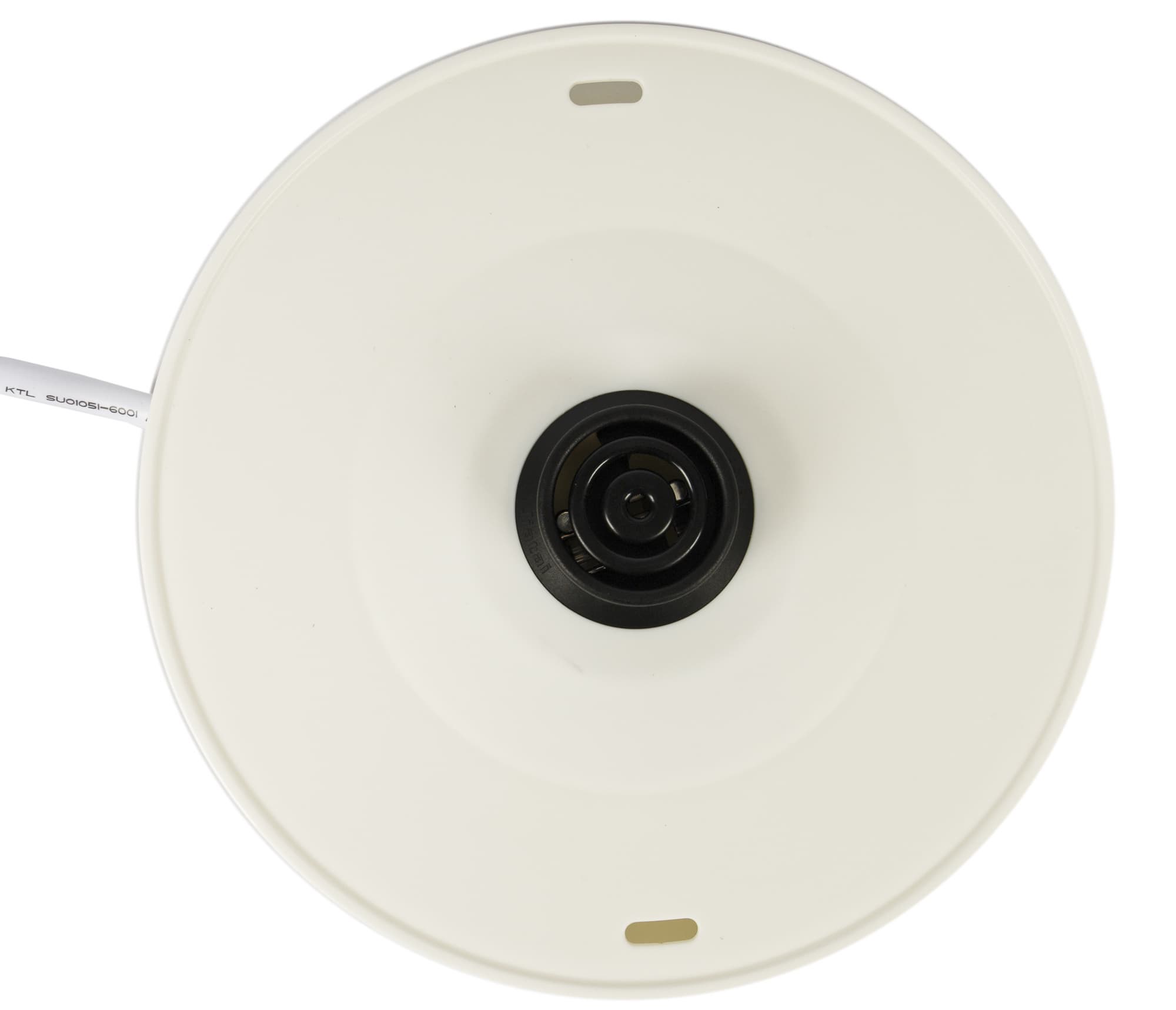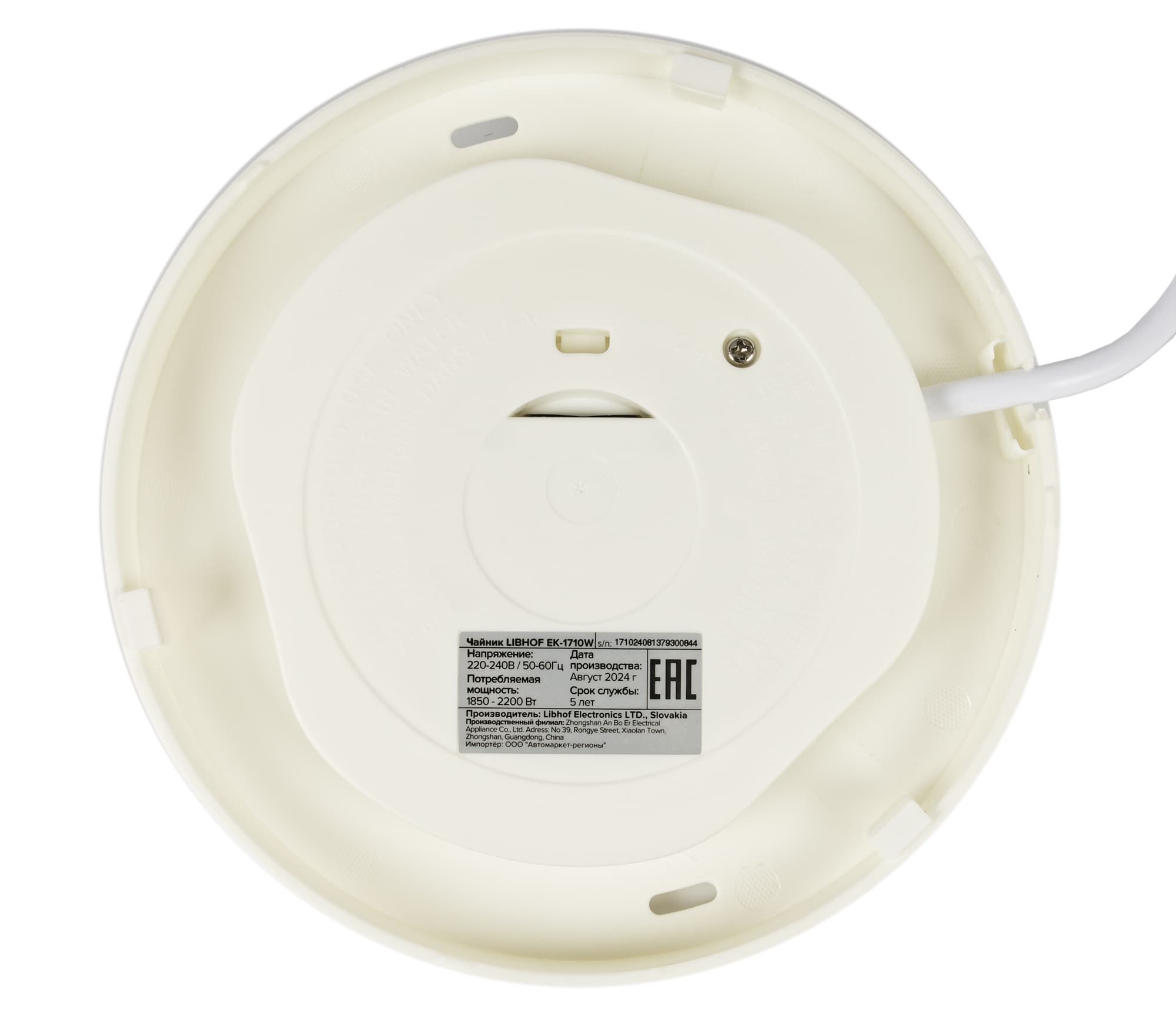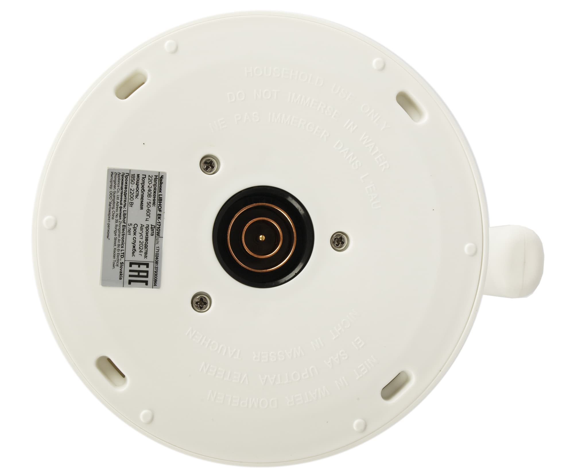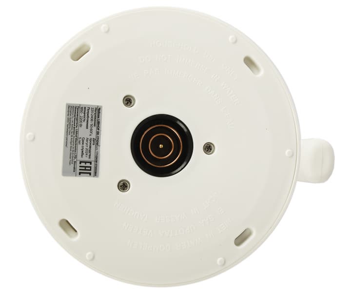 На дне корпуса расположен традиционный круглый контакт для подключения к базе, что позволяет поворачивать чайник на 360° и использовать в любом положении. Рядом с контактом — наклейка с названием производителя, модели, серийным номером и краткими техническими характеристиками.