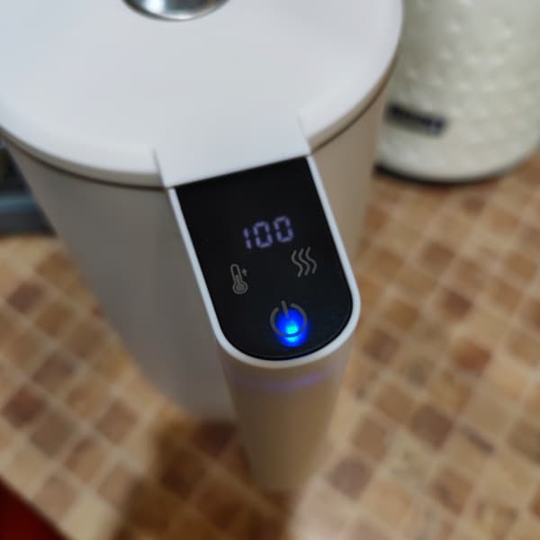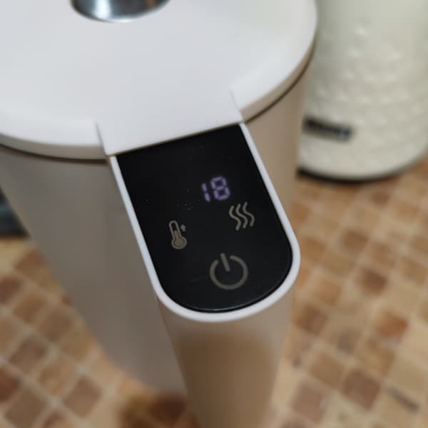 Чайник, включенный в розетку, отображает текущую температуру воды.
