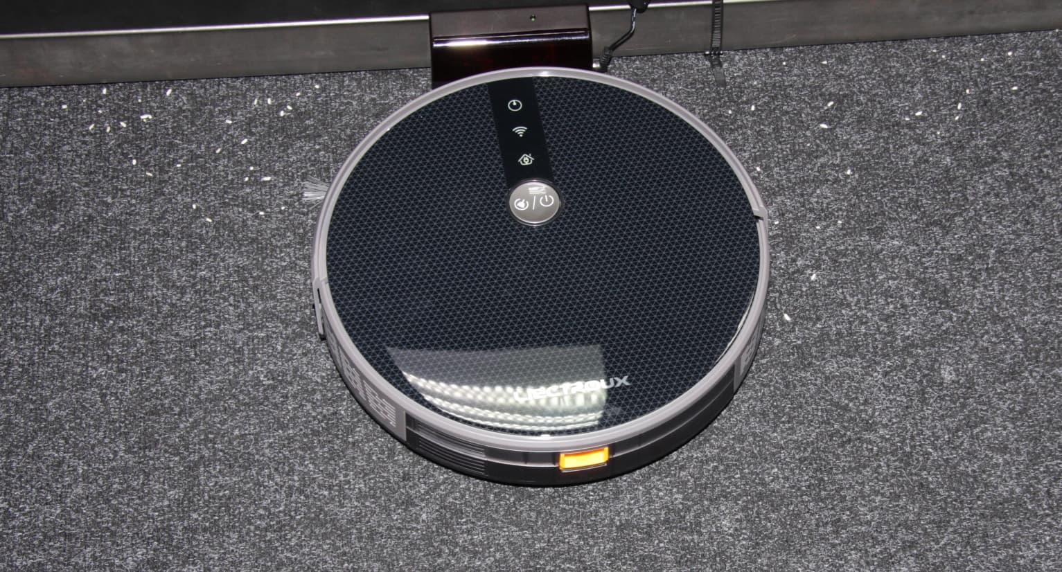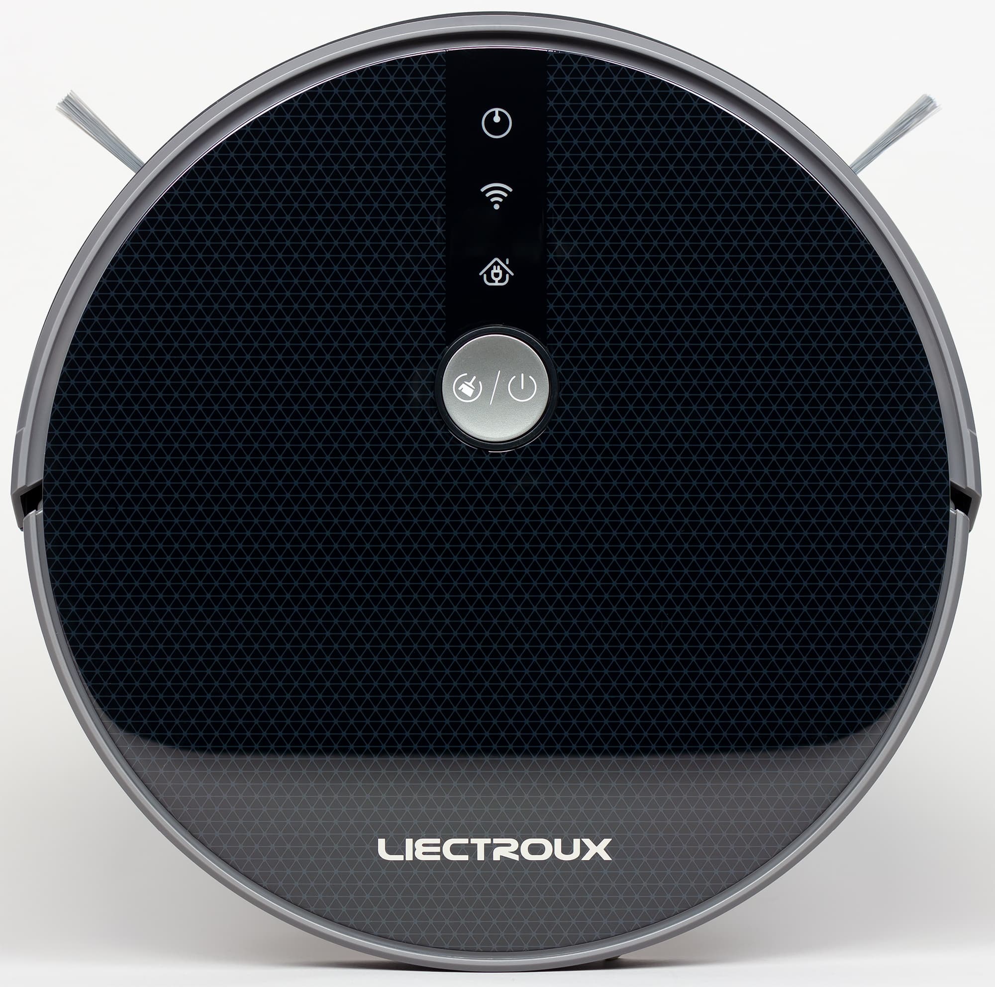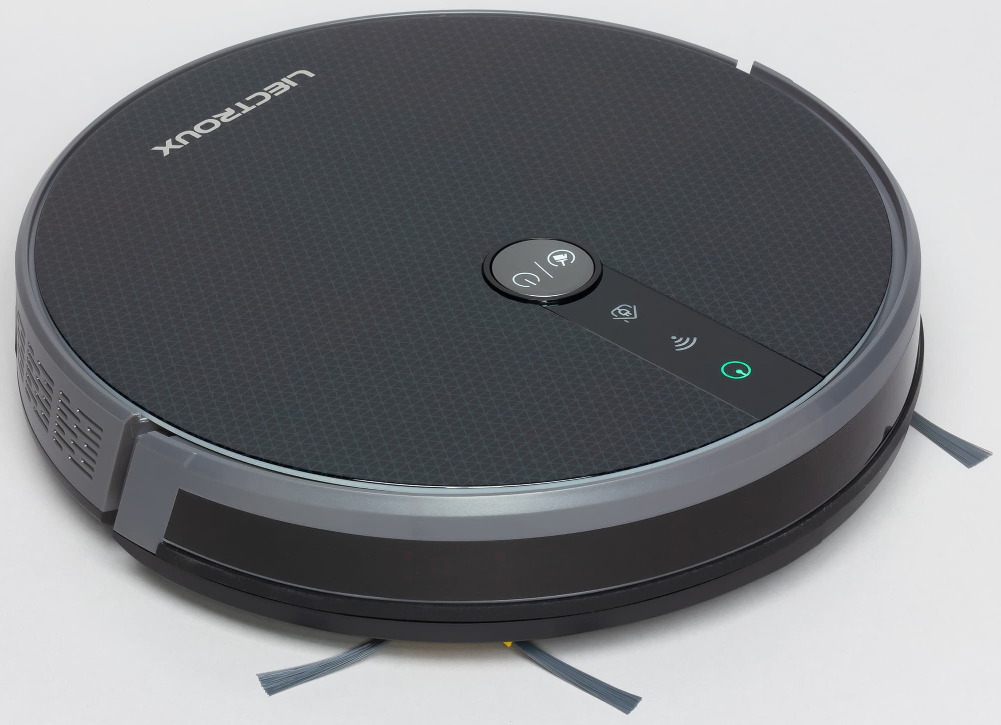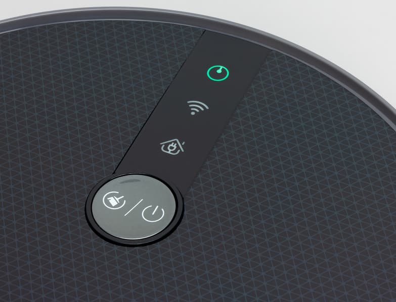 Верхняя панель ламинирована прозрачной пленкой, относительно устойчивой к царапинам. Пленка прикрывает геометрических узор и серебристый логотип. Преимущественно темный цвет корпуса осложняет поиск робота в темных закоулках квартиры, когда он по какой-то причине не вернется на базу, также робота сложнее заметить боковым зрением, когда он путается под ногами, а значит, с большей вероятностью на него можно наступить. На верхней панели чуть ближе к передней части есть одна механическая кнопка отвечающая за запуск/остановку уборки, включение/выключение робота и за включение режима подключения к Wi-Fi. Перед кнопкой есть значки трех индикаторов состояния. В зависимости от текущего состояния они светятся или мигают зеленым, оранжевым или красным. Яркость индикаторов достаточно высокая, чтобы рассмотреть их в освещенном помещении.