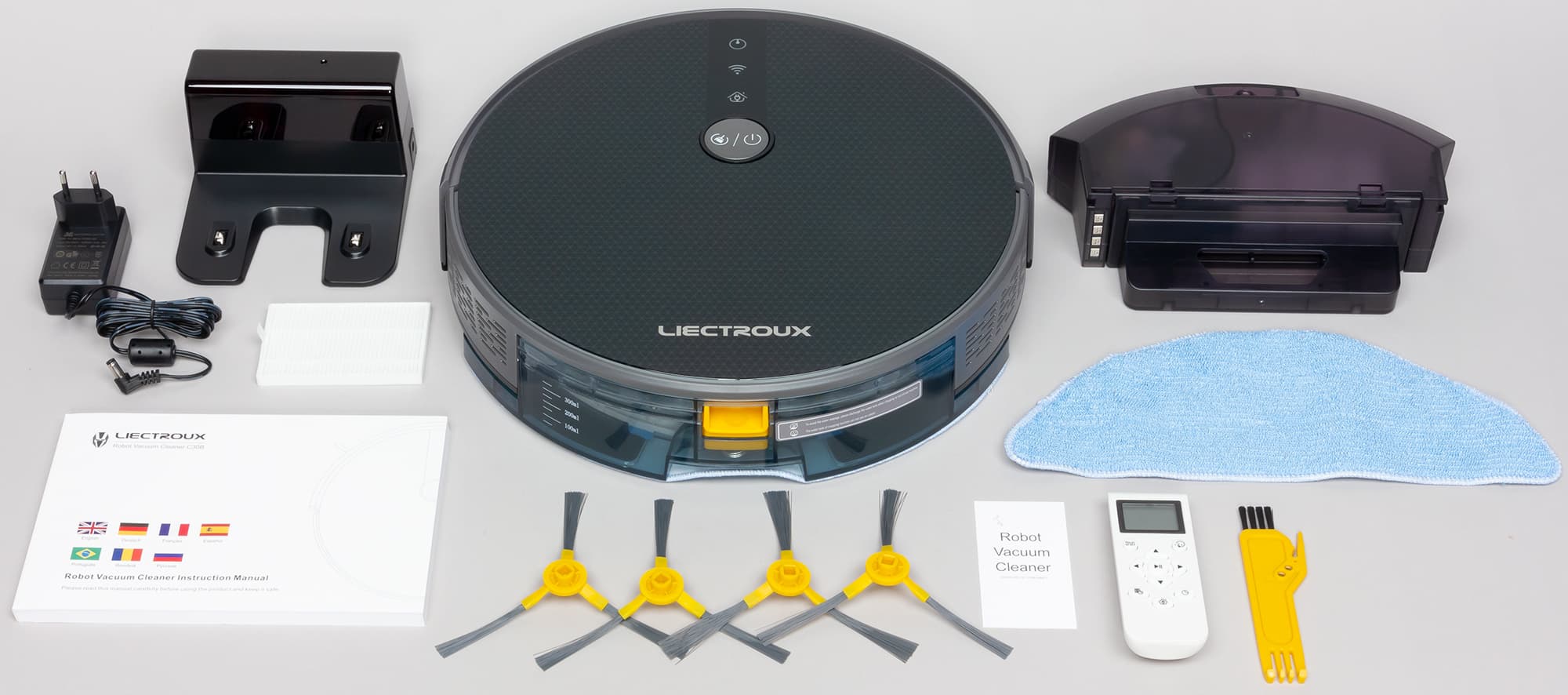 Запасные части и расходные материалы в комплекте поставки представлены сменным складчатым фильтром последней ступени, парой салфеток из микроволокна и вторым комплектом боковых щеток. Есть и комбинированный инструмент для очистки основной щетки, пылесборника и т. д. Руководство пользователя представляет собой относительно толстую книжку с текстами на нескольких языках, включая русский. Качество текста и полиграфического исполнения достаточно высокое.