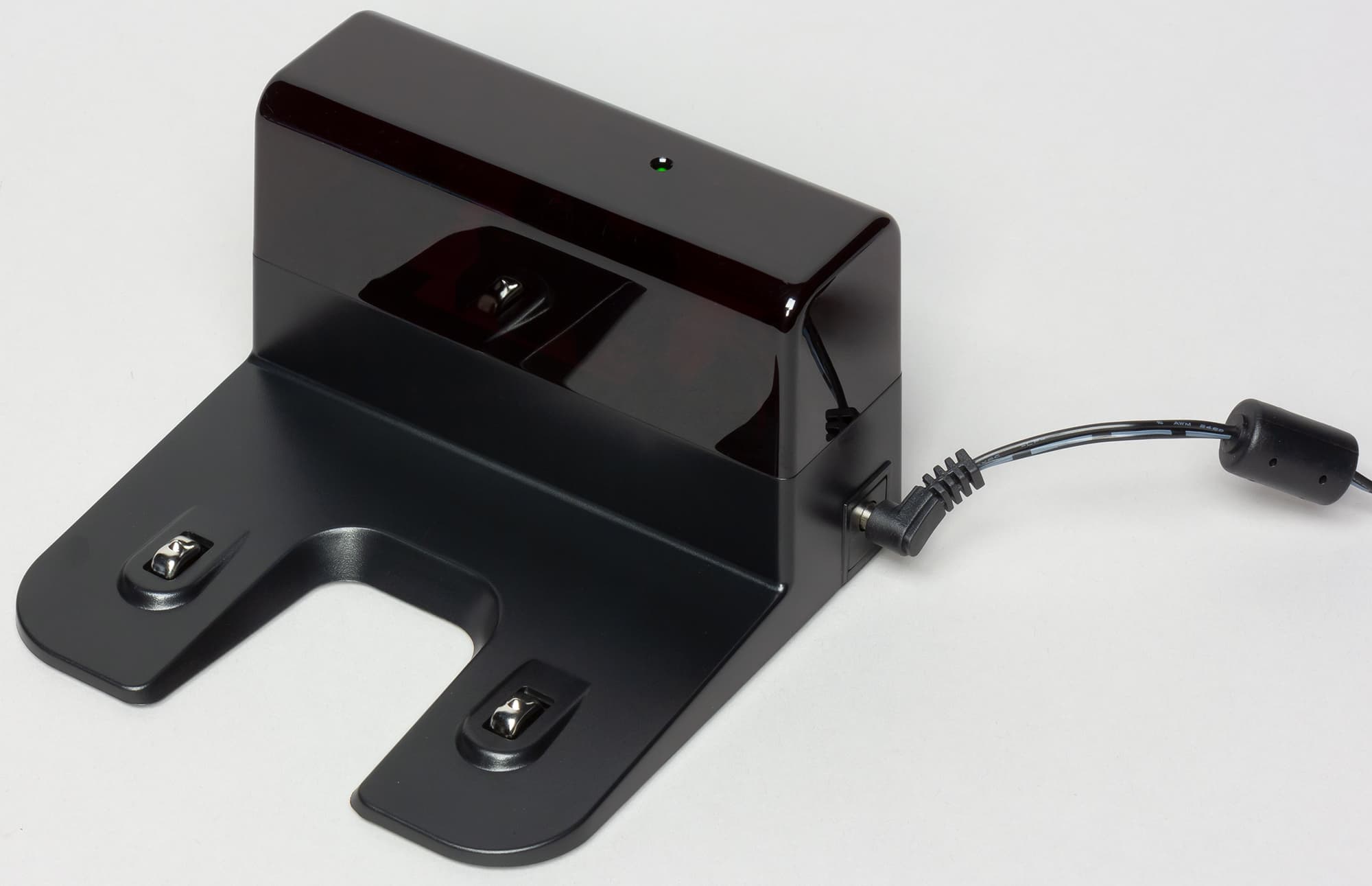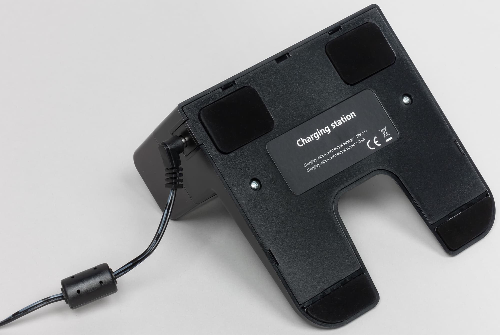 База, на которой пылесос заряжается, имеет относительно большое основание, на которое снизу наклеены четыре противоскользящие накладки из резины.