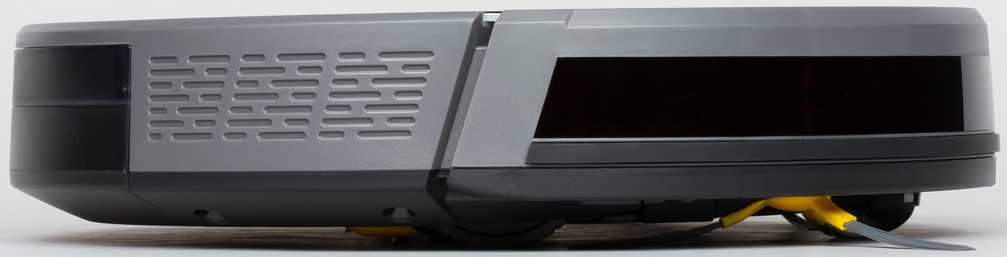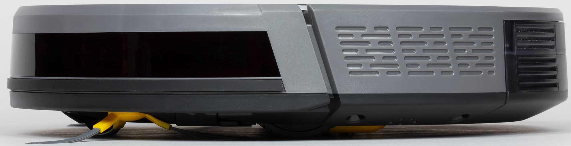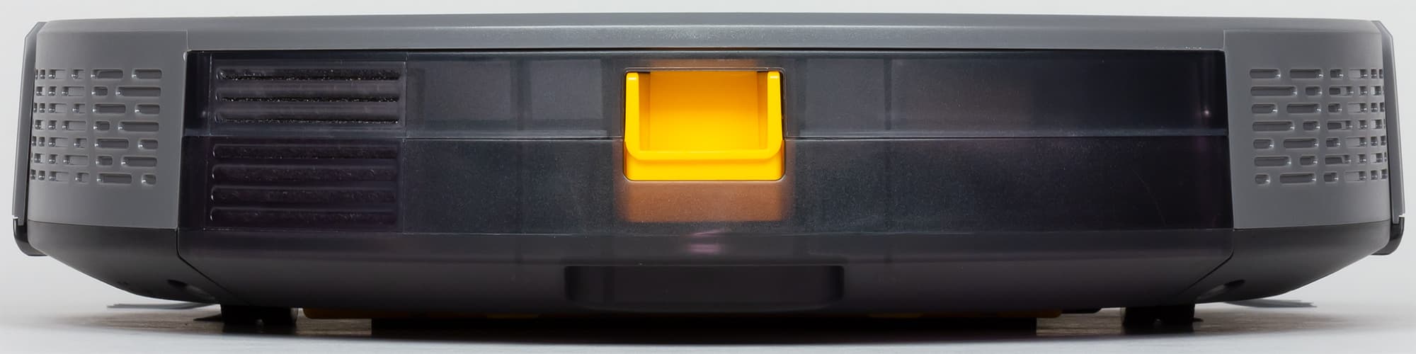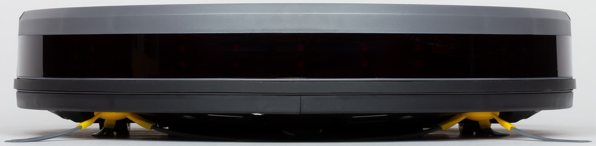 Края снизу скошены, что помогает роботу преодолевать препятствия, а выраженный бортик сверху снижает вероятность того, что пылесос будет застревать под препятствиями с небольшим просветом.