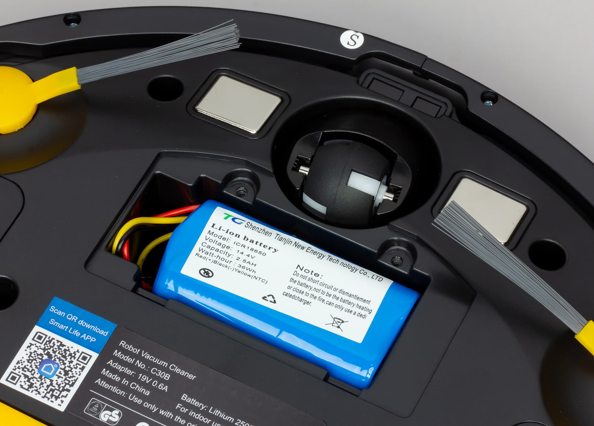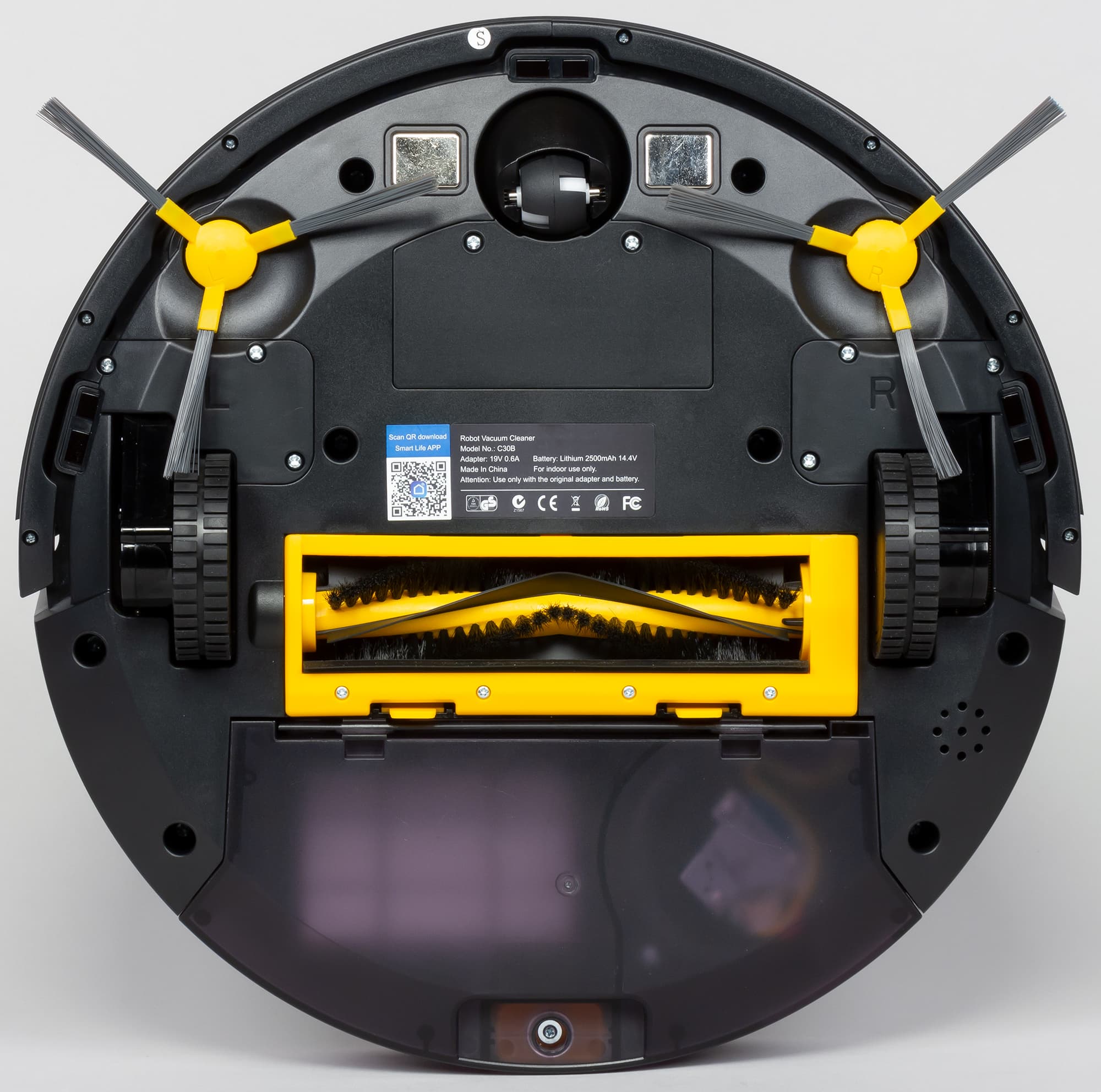 На днище расположены две контактные площадки, передний опорный поворотный ролик, боковые щеточки, крышка батарейного отсека, два ведущих колеса, отсек основной щетки и решетка громкоговорителя. Ближе к краю сразу за бампером расположены три ИК-датчика перепада высоты, благодаря которым робот-пылесос может избежать падения со ступенек.