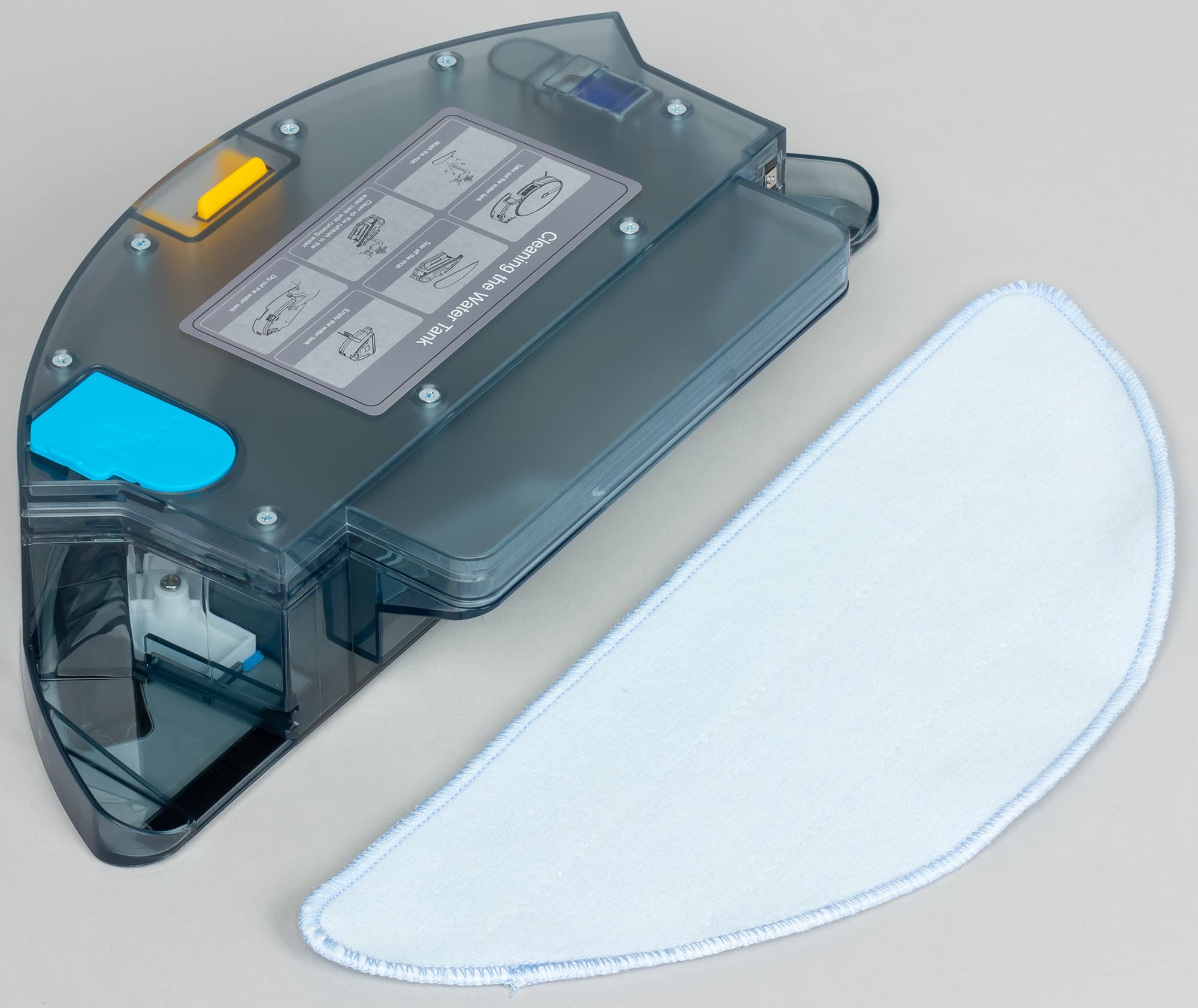 На дно блока на липучке прикрепляется махровая салфетка из микроволокна. Салфетку можно предварительно увлажнить, а для поддержания ее во влажном состоянии, в бак нужно залить воду. Жидкость на салфетку просачивается через шесть отверстий в днище резервуара. В процессе уборки нужно следить за уровнем воды, чтобы при необходимости долить воду в бак. Электромагнитный клапан, установленный в блоке, дозирует вытекание воды. В режиме влажной уборки всасывающий вентилятор отключается, а основная и боковые щеточки вращаются, поэтому немного мусора забрасывается в небольшой отсек в передней части блока для влажной уборки. Перед зарядкой робота блок для влажной уборки нужно снять. Экспериментально определенный объем емкости для воды равен 422 мл.