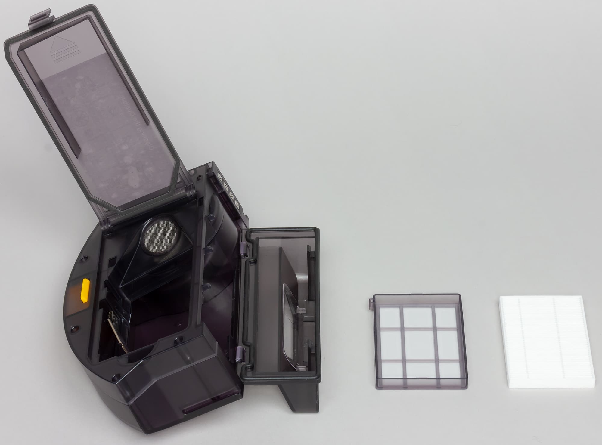 Нажав на фиксатор сзади, можно отсоединить пылесборник от корпуса робота. Входное отверстие расположено на достаточной высоте, чтобы при аккуратных манипуляциях с закрытым пылесборником мусор не выпадал. Дополнительно отверстие изнутри прикрывает шторка из прозрачного пластика. Передняя часть пылесборника откидывается на большой угол, что позволяет вытряхнуть скопившийся мусор или почистить пылесборник обычным пылесосом с щелевой насадкой. Для полной очистки нужно открыть верхнюю крышку, вынуть рамку с предварительным сетчатым фильтром, стряхнуть с него легкий мусор, и при необходимости извлечь из рамки и почистить складчатый фильтр тонкой очистки.