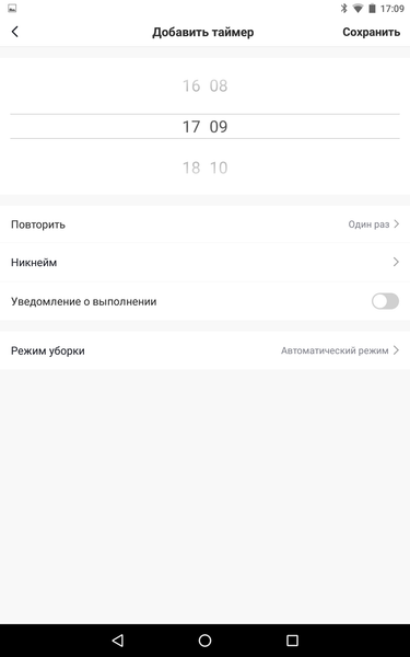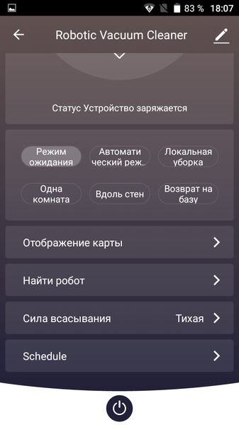 Запустив приложение первый раз, нужно установить связь с роботом, который должен быть в радиусе действия Wi-Fi-сети (поддерживается только 2,4 ГГц). Для управления роботом используется глобальный облачный сервис (необходима регистрация), поэтому доступ к роботу можно получить из любого места, где есть Сеть. С помощью приложения робот запускается на уборку, уборка приостанавливается или принудительно завершается, также робот по команде пользователя отправляется на базу, а функция «Найти робот» поможет это сделать — робот отзовется звуковым сигналом. В приложении можно задавать расписание уборки (уже по дням недели) и управлять мощностью вентилятора (уже три ступени). Во время уборки в окне приложения отображается карта, построенная роботом, что, например, позволяет контролировать его поведение.