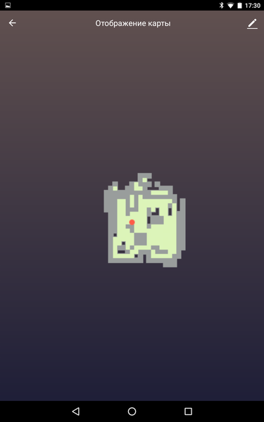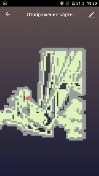 В случае нашего тестового участка в начале уборки робот, двигаясь змейкой, проходит доступную ему часть территории, и возвращается к тем местам, которые он еще не убрал, а затем обходит помещение по периметру. Карта тестового помещения после почти полного завершения одного из циклов уборки: