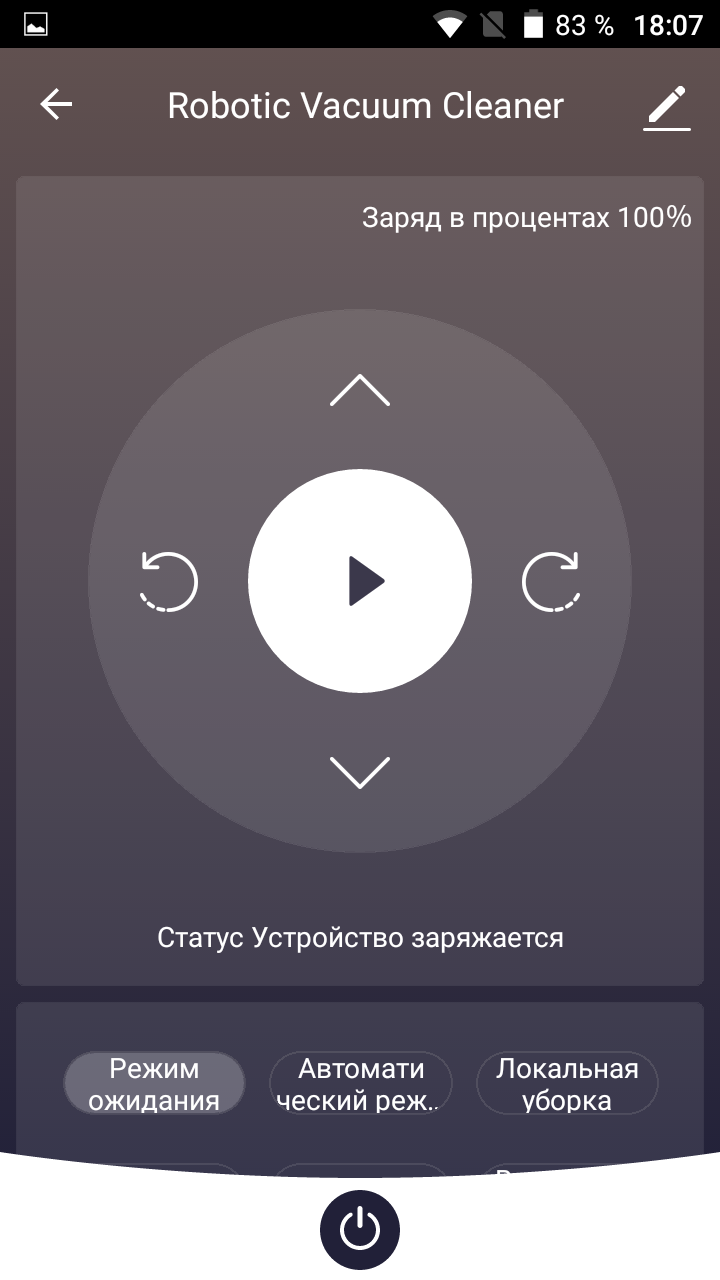 Во время сухой уборки нажатие на кнопку со значком змейки повышает мощность всасывающего вентилятора робота, а второе нажатие — понижает.
