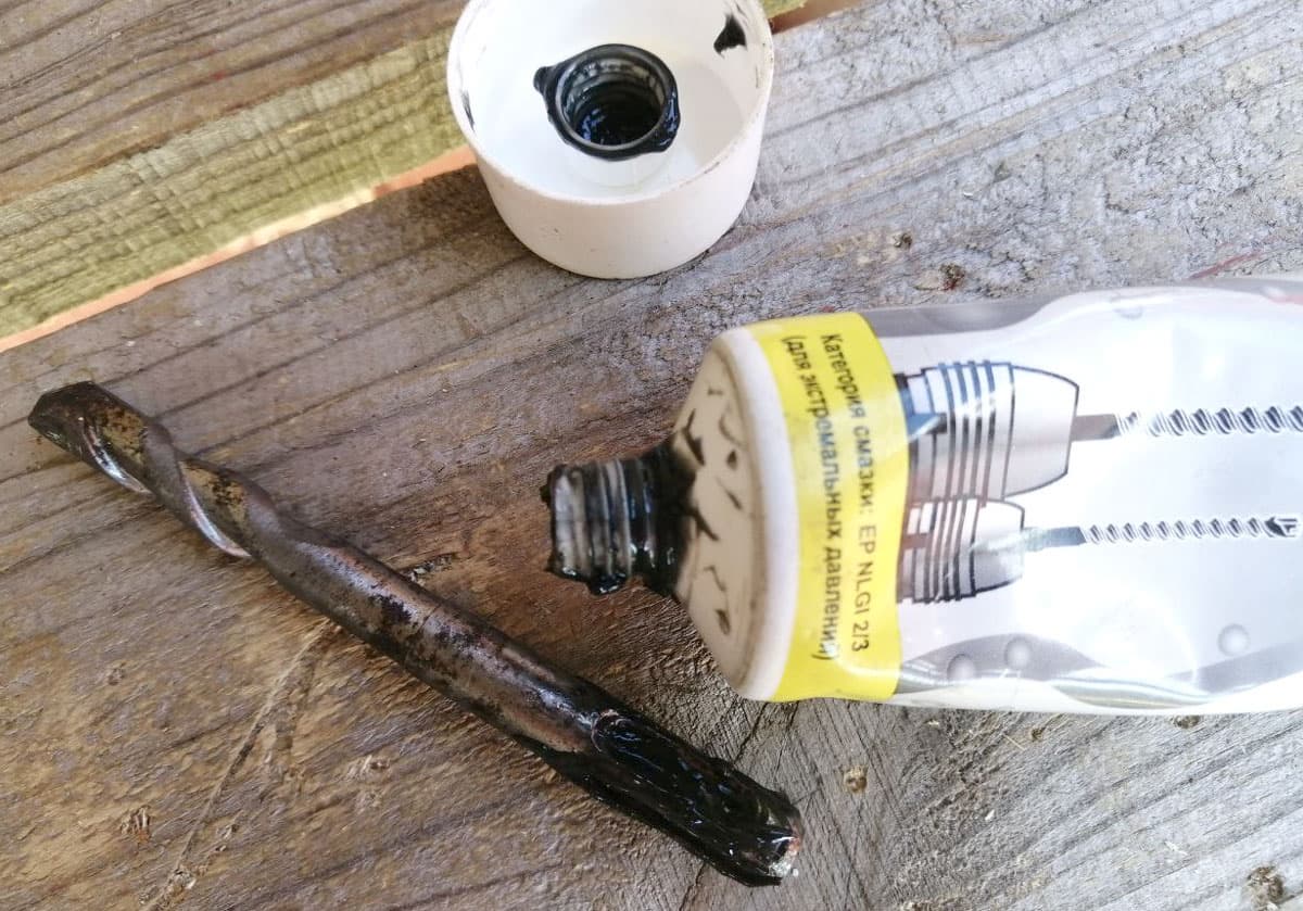 Смазку следует наносить обильно, особое внимание уделяя именно канавкам. Остаток смазки, выступивший из патрона, можно снять тряпочкой. Даже нужно, поскольку при бурении эта смазка разлетится в стороны, и вы испортите обои. Как это сделали в квартире автора горе-монтажники, устанавливавшие кондиционер. Ух, неаккуратные!