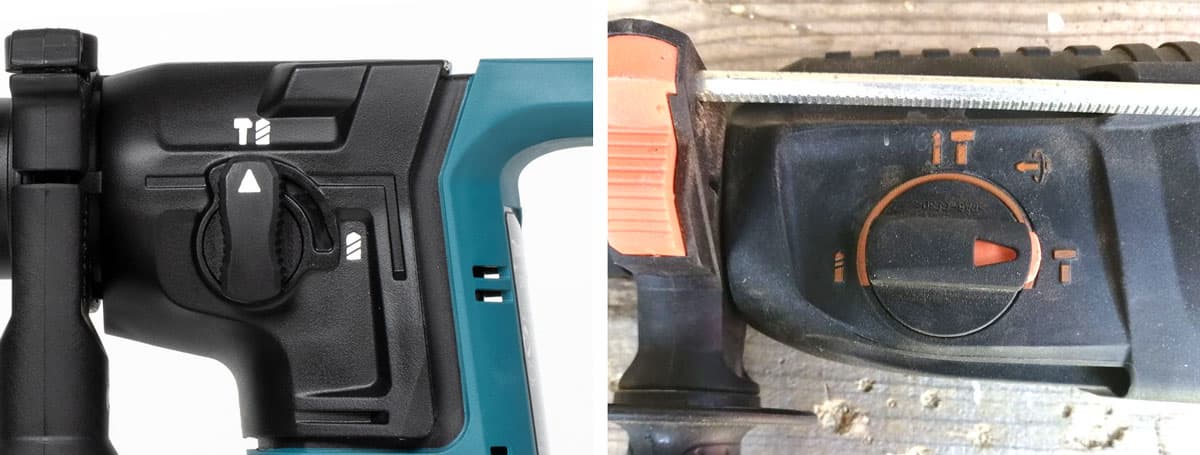 Перфораторы можно условно поделить на два класса: имеющие режим отбойного молотка и лишенные такого режима. Наша дрель, к сожалению, не умеет играть роль отбойного молотка. Ей можно только сверлить, либо сверлить с ударом. На следующем фото показаны два перфоратора, слева наша Makita, а справа — перфоратор с режимом долбления и патриотичным названием. Он, кстати, пригодится нам, когда станем оценивать эффективность работы рассматриваемого инструмента.