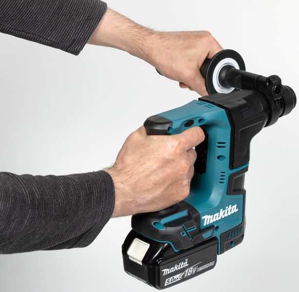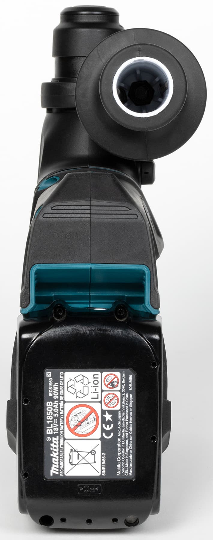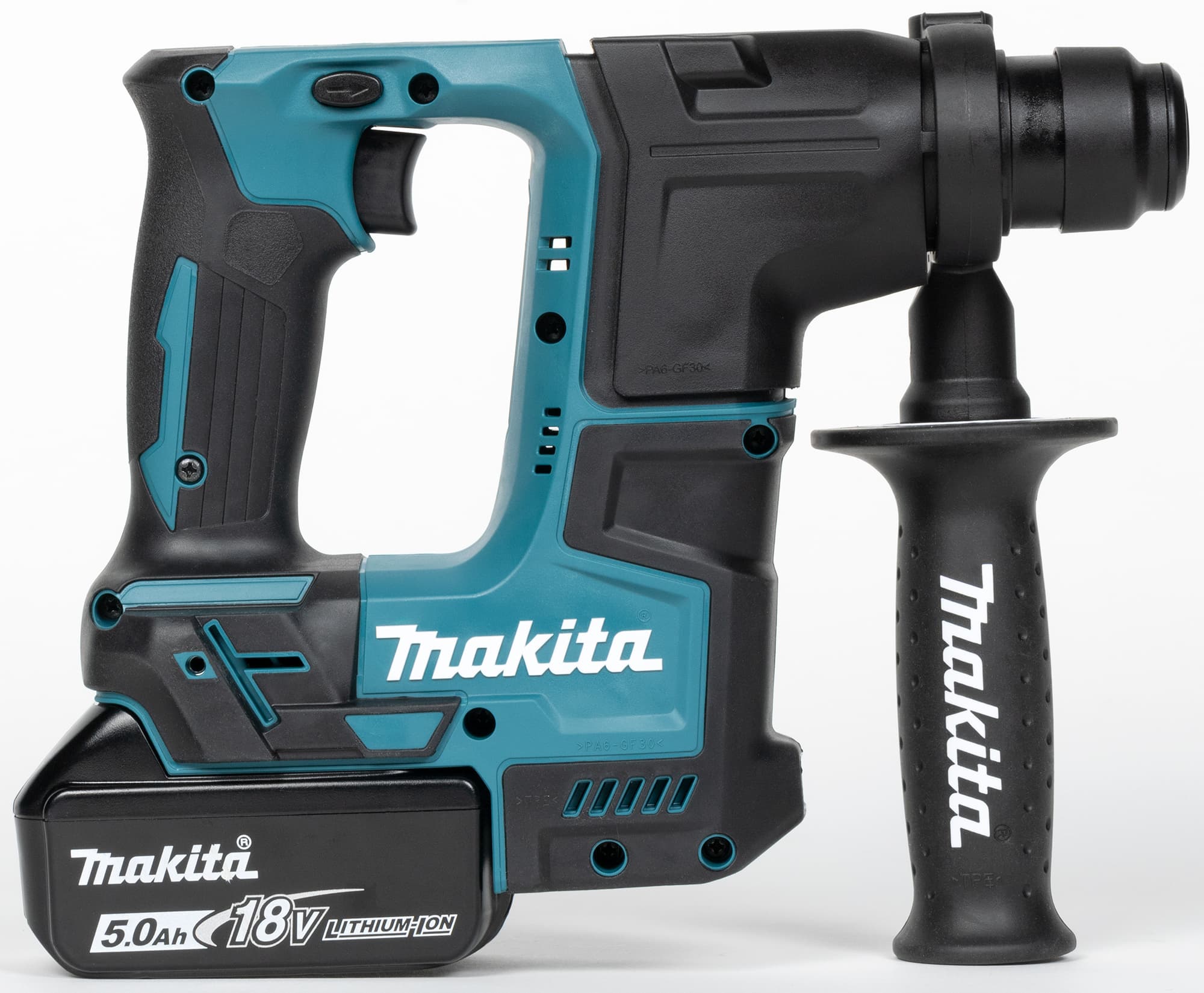 Для тестирования перфоратора мы воспользовались имеющейся зарядной станцией, которая фигурировала в обзоре аккумуляторного лобзика Makita DJV182Z. К ней прилагаются аккумуляторы с солидным запасом энергии, имеющие емкость 90 Вт·ч (5,0 А·ч).