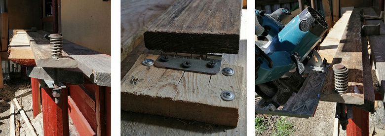 Чтобы ускорить работу и сделать ее удобной, пришлось соорудить несложную приспособу — быстрозажимной «механизм», состоящий из длинной гибкой доски, с одного конца жестко закрепленной на петле, а с другого имеющей фиксатор с пружиной. Выглядит страшно, однако поставленную задачу выполняет сносно.
