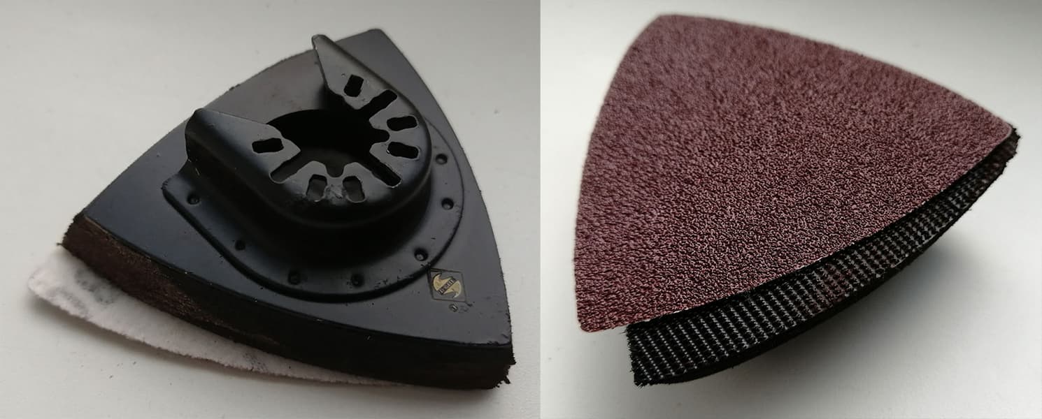 У шлифовальной насадки, которую мы приобрели, имеется мелкий недостаток: недостаточно сильный зацеп сменных полотен. Если во время работы инструмент сильно прижать к обрабатываемой поверхности, эта шкурка имеет обыкновение съезжать. И чем выше скорость вибрации, тем активнее сползает полотно. Наверное, просто невысокого качества насадку купили.