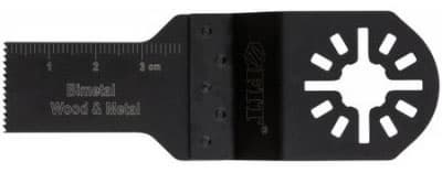 Это, собственно, вторая по «главности» и важности способность реноватора — выпиливание сквозных отверстий или пазов без предварительного сверления. Такие операции производятся с помощью пильной насадки, форма которой отличается от формы предыдущей, используемой для обычного продольного пиления. Полотно для впиливания имеет прямоугольные края с зубьями, что позволяет насадке вгрызаться в материал. Зачастую такие полотна имеют насеченные или напечатанные линейки, что позволяет контролировать глубину вреза.