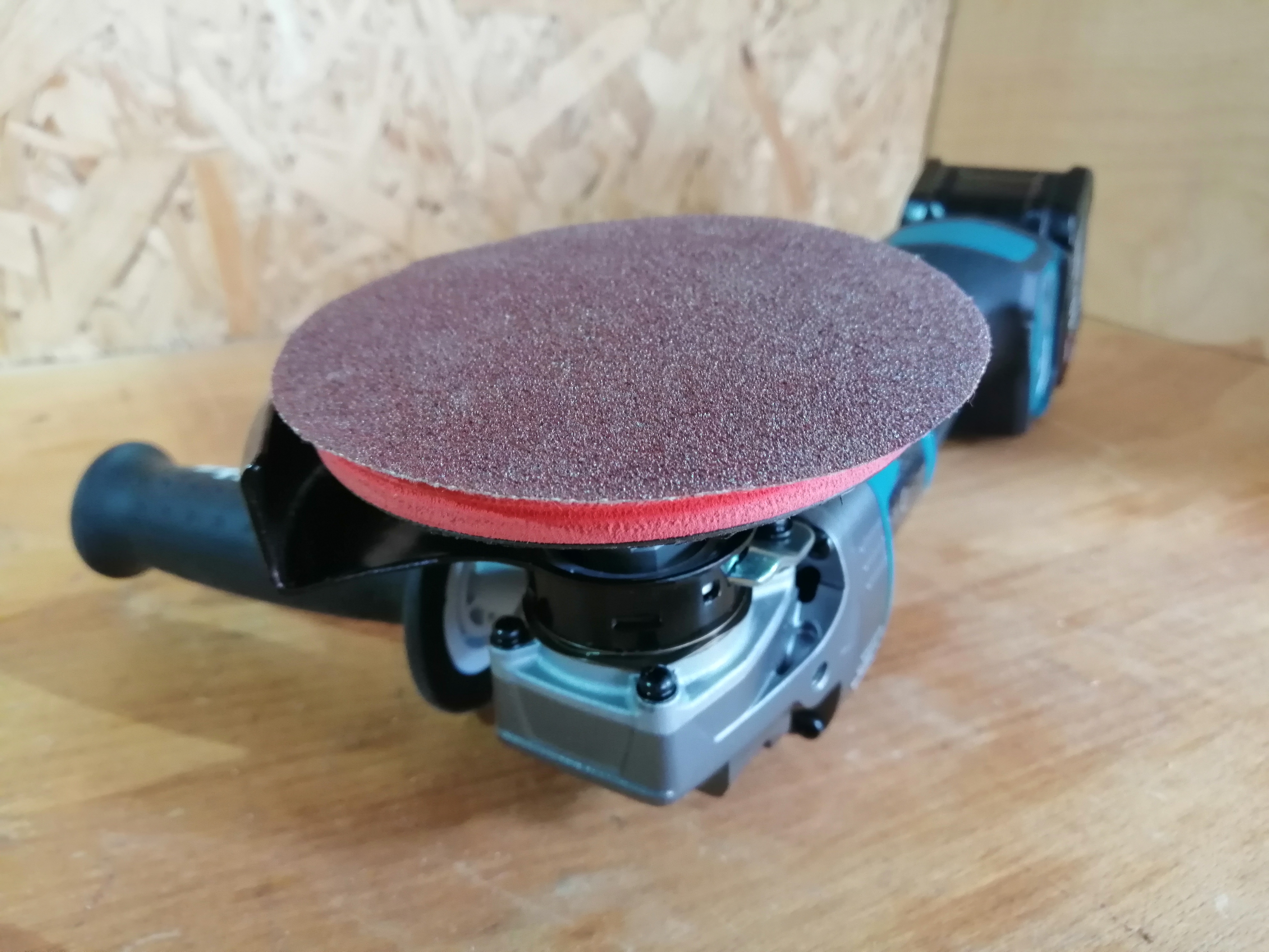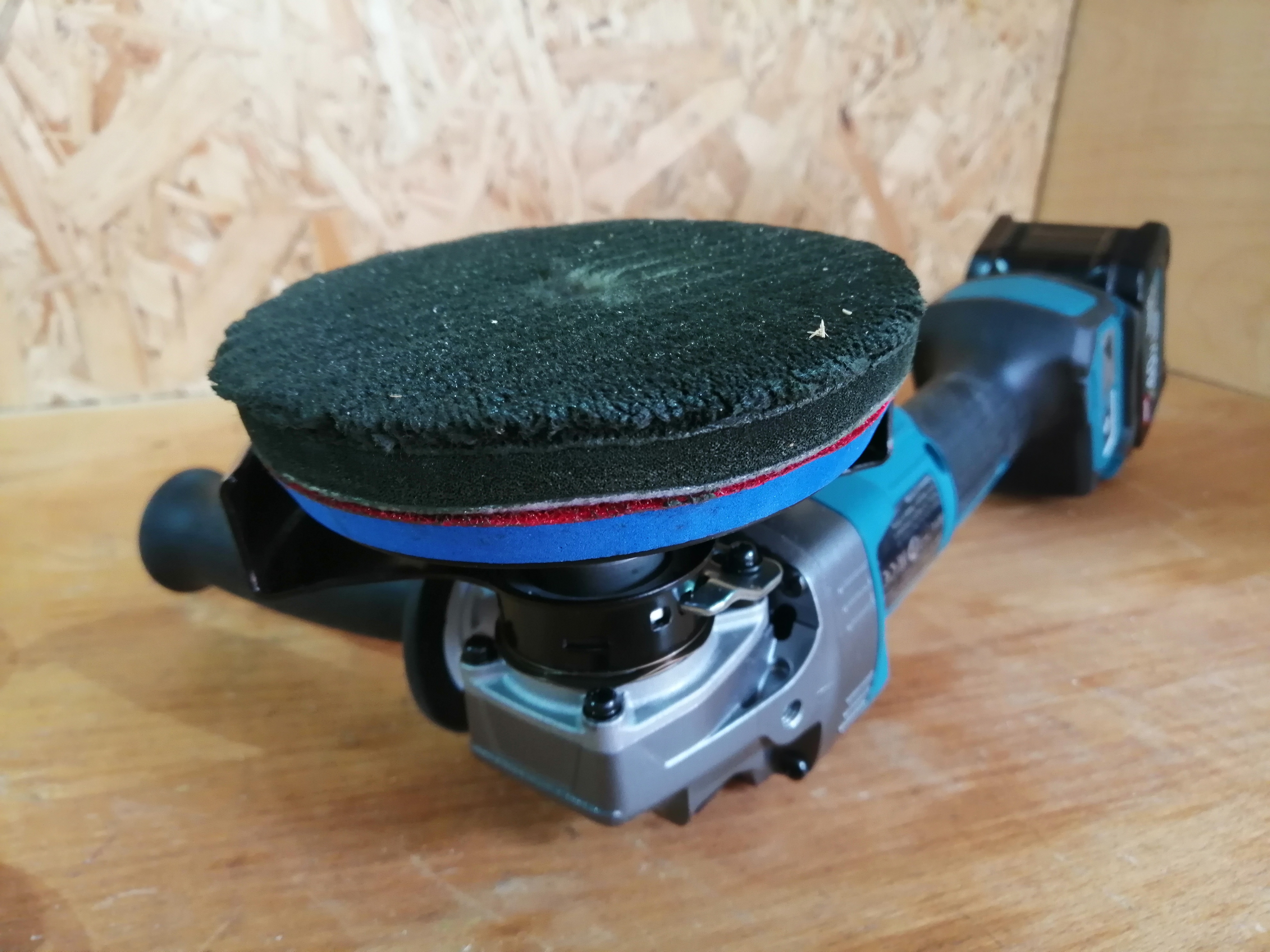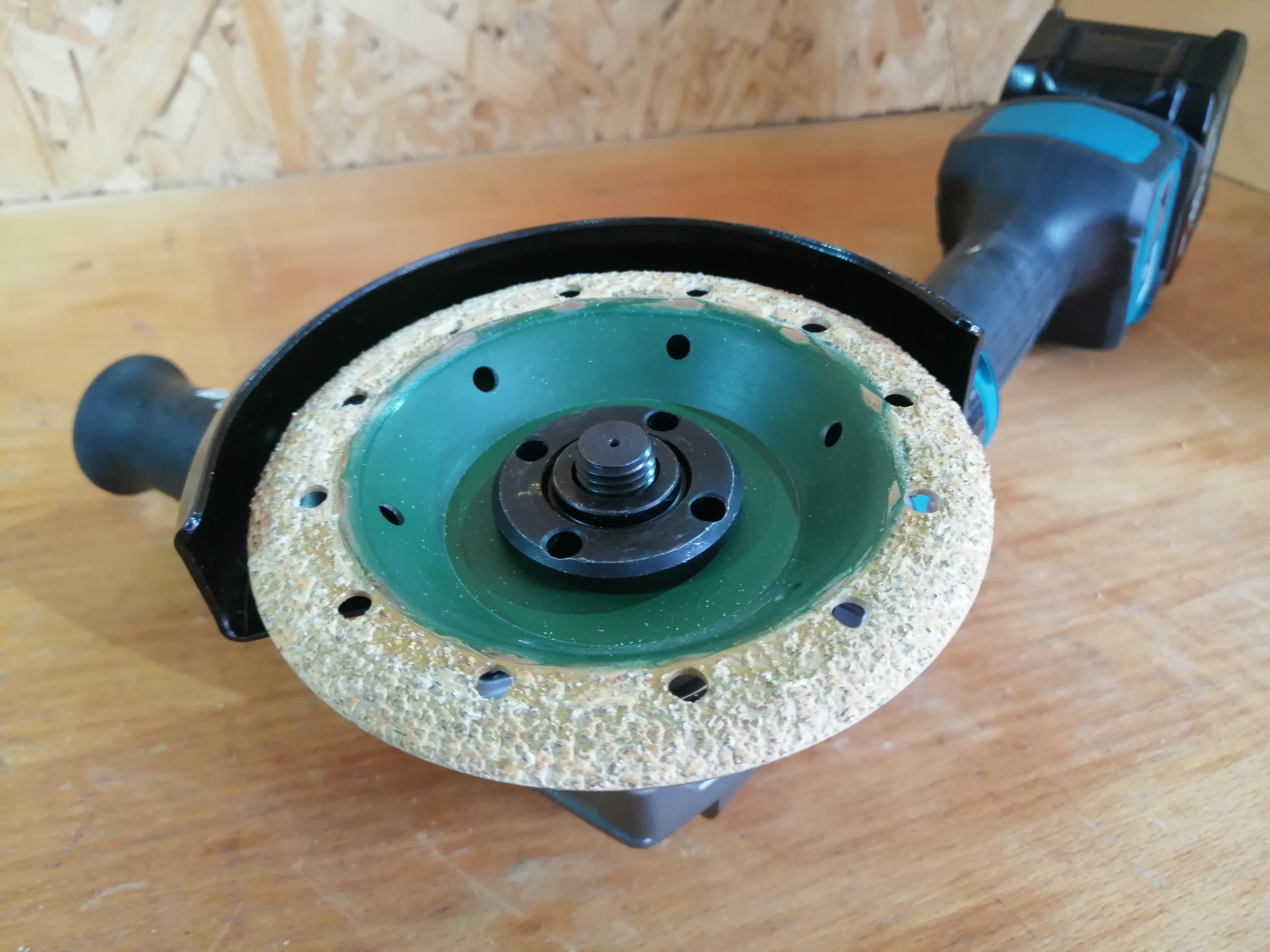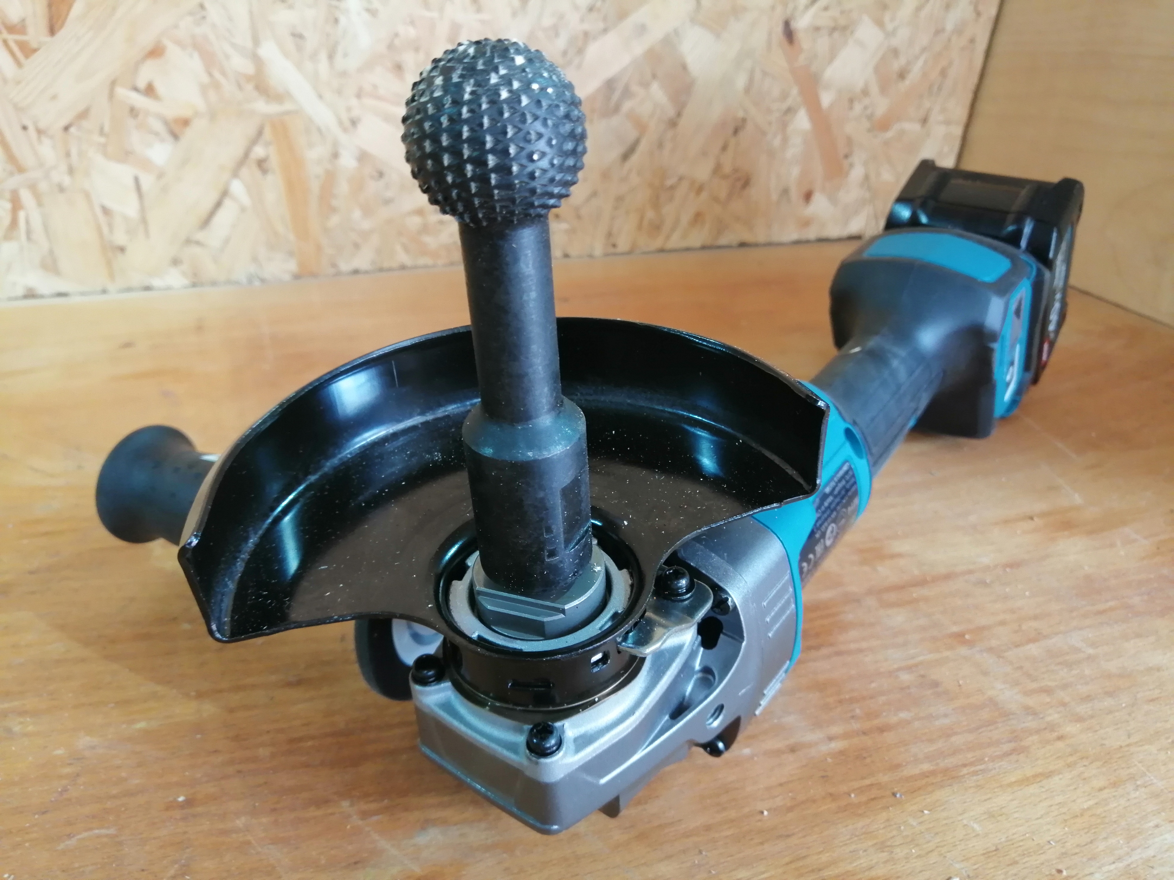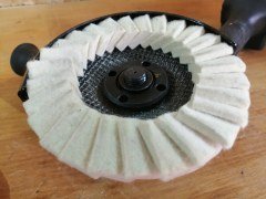 Помимо большого диаметра, кожух также имеет солидную высоту бортиков, аж 30 мм. Из-за такой высоты борта, орудовать прилагаемым ключом можно только в открытой зоне, вне кожуха. Кстати, ключ имеет плоскую форму, из-за чего некоторые типы насадок почти невозможно зафиксировать. Например, сантиметровая высота войлочных лепестков в этой насадке затрудняет затягивание гайки.