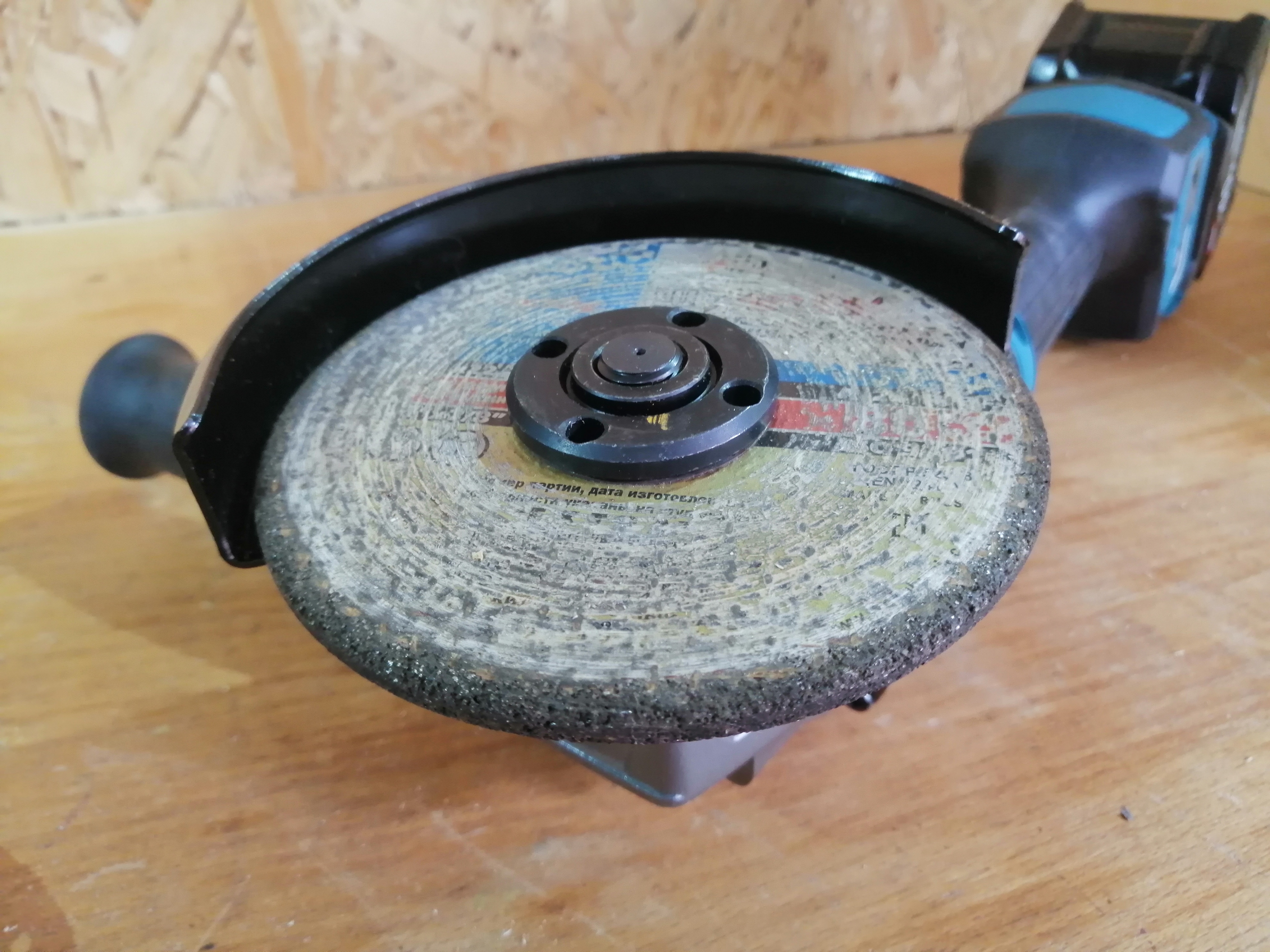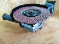 Следующий ролик многократно ускорен и снабжен счетчиком времени. Можно видеть, что аккумулятора хватило на 10 с половиной минут шлифования металла лепестковой насадкой.