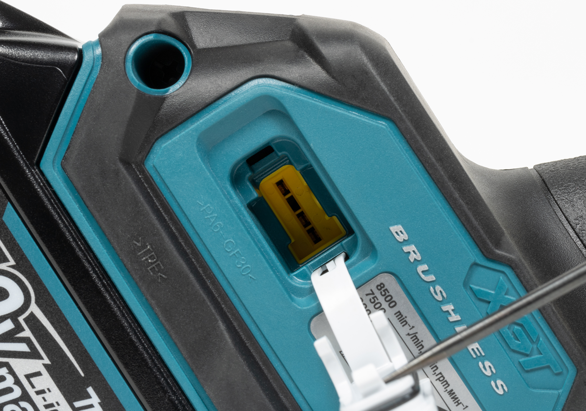 Да, так и есть. Это миниатюрная панель управления радиосоединением с пылесосом, в котором поддерживается данная функция. Панель вынимается из углубления, удерживаясь шиной, по которой передается питание и информация. В открывшемся углублении можно видеть четырехконтактный порт, куда должен вставляться специальный приборчик — беспроводной блок Makita.