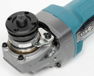 Рассматриваемая болгарка имеет стандартную ось с опорной площадкой. Для фиксации насадки прилагается гайка, которая навинчивается на резьбу оси и затягивается ключом.
