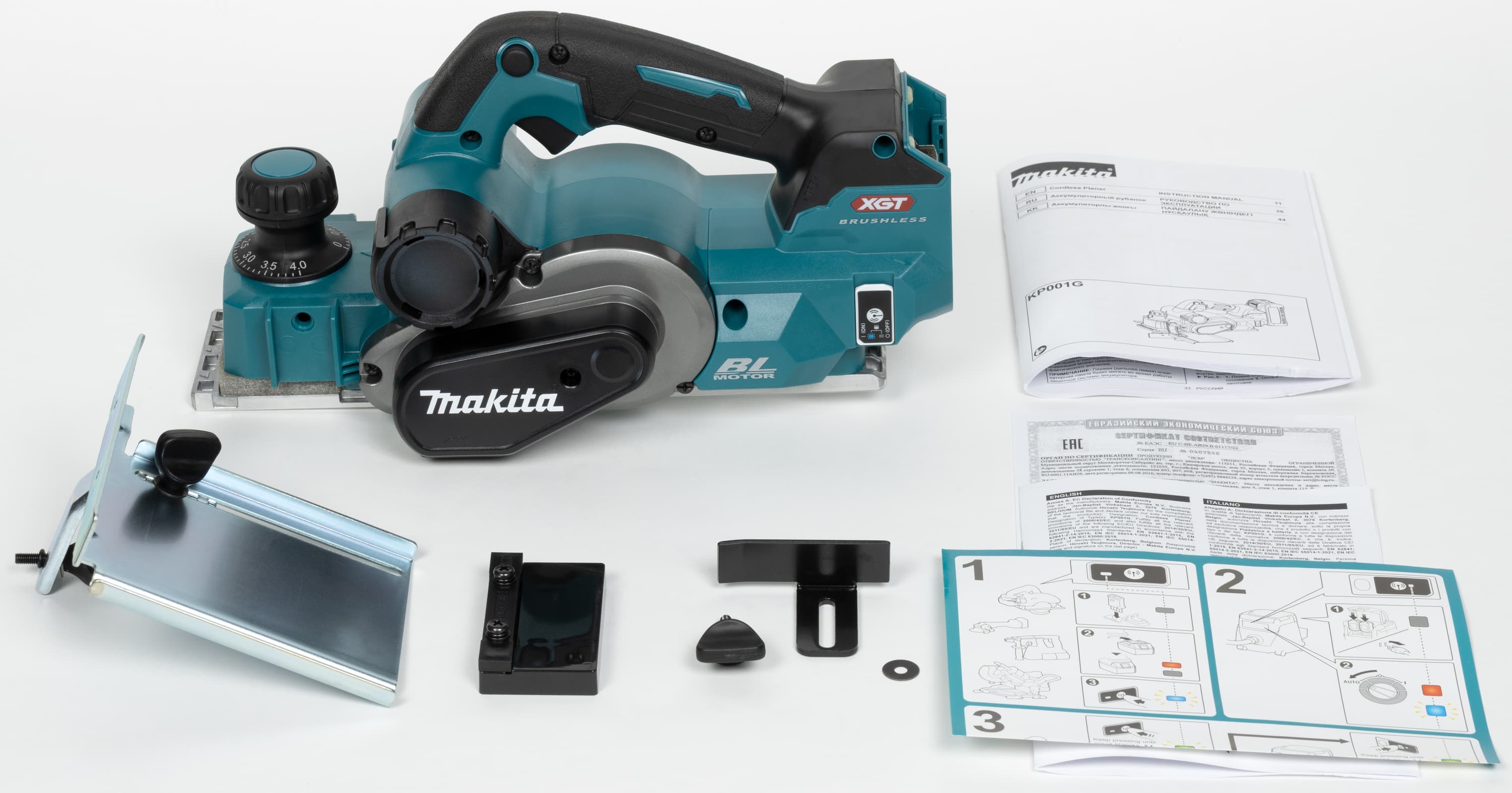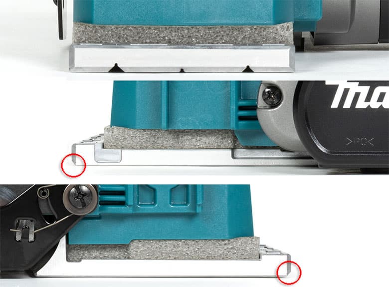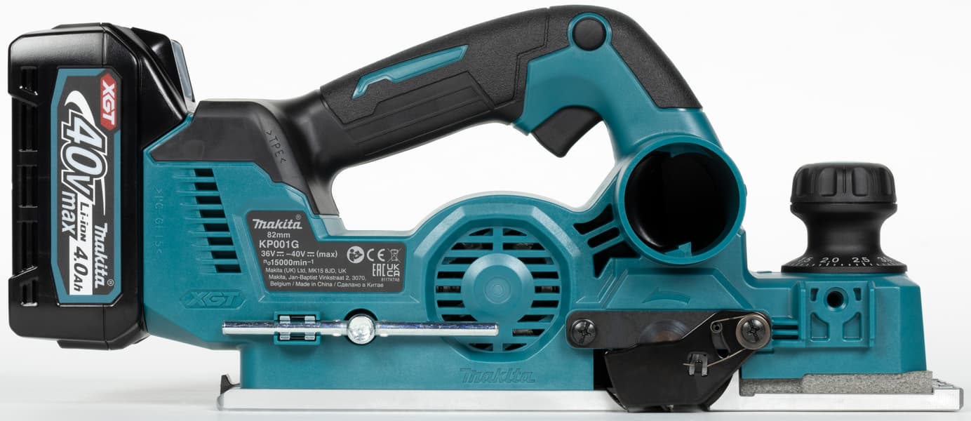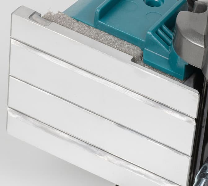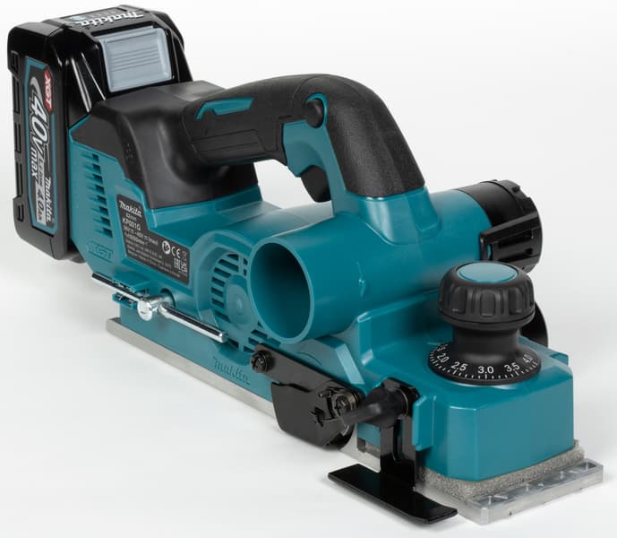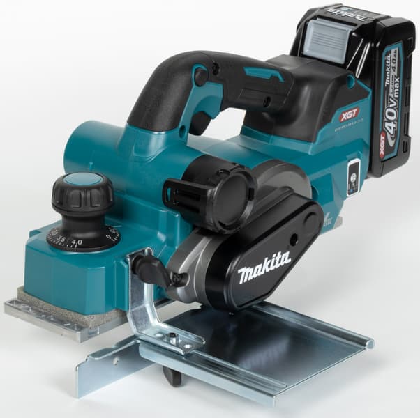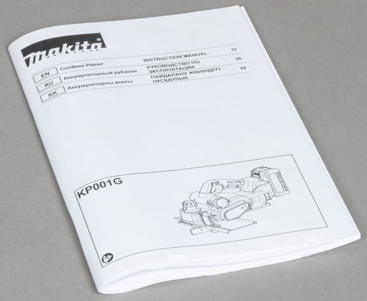 Впрочем, другие положительные аспекты тоже не будут лишними. Плавный старт и электрический тормоз, поддержание оборотов под нагрузкой, защитный рычаг, трехразмерные V-образные канавки для снятия фаски, бесключевая установка упоров — эти качества относят рубанок Makita KP001GZ к профессиональному классу инструментов.