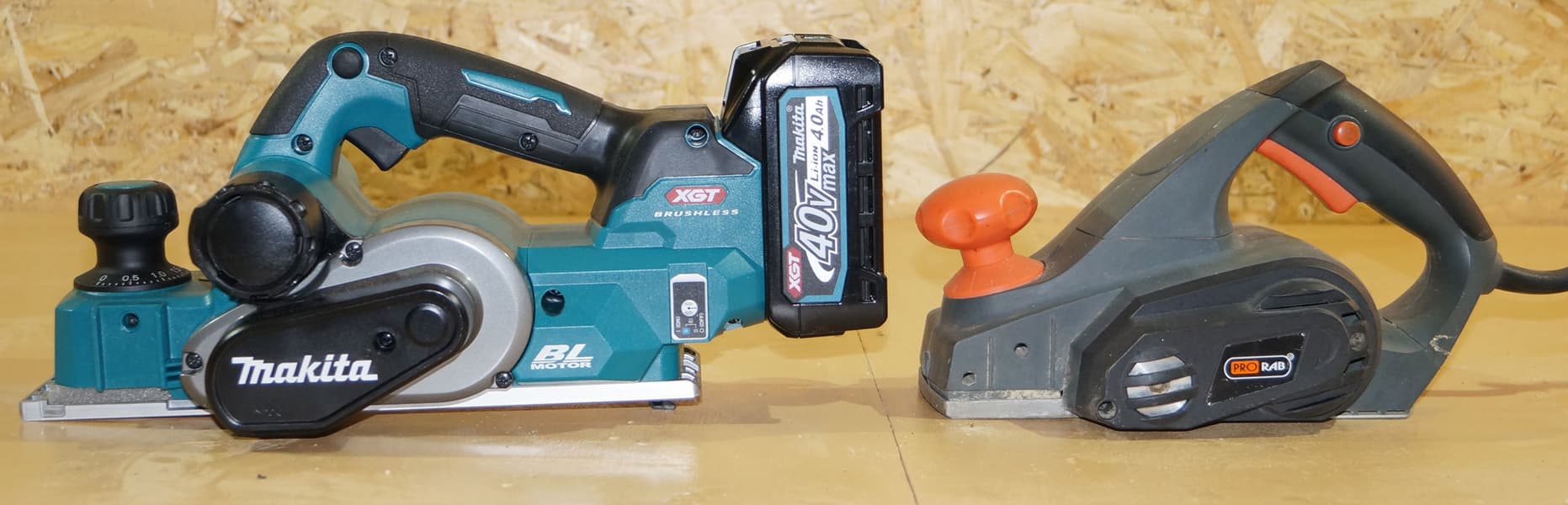 Чтобы представить разницу с обычным скромным электрорубанком, который имеет аналогичную ширину строгания, сравните их габариты: