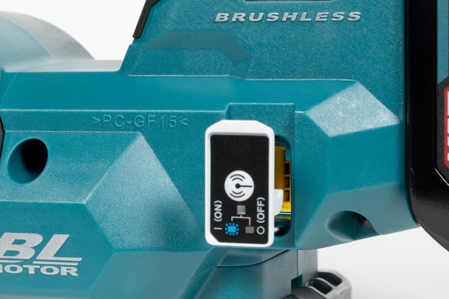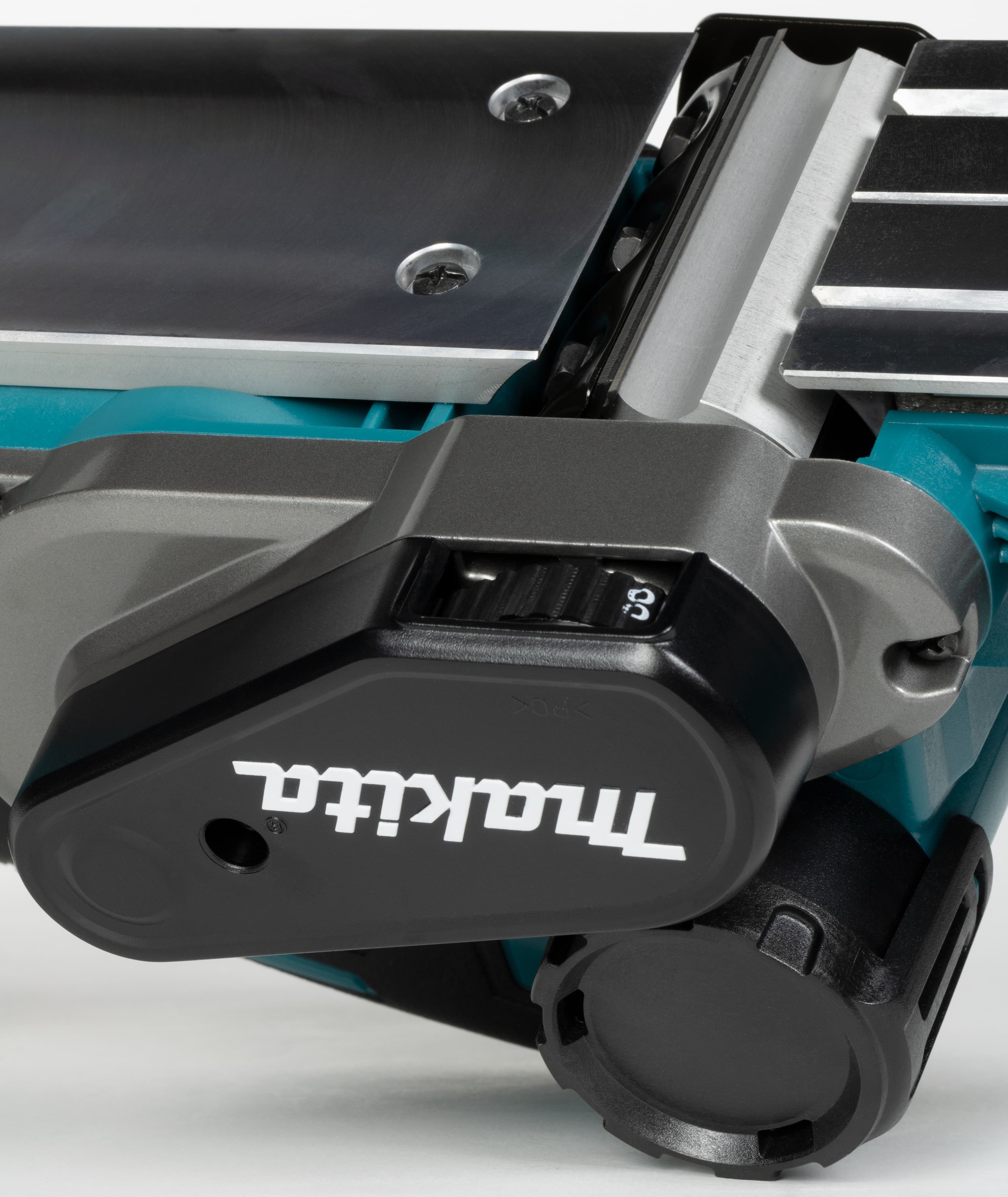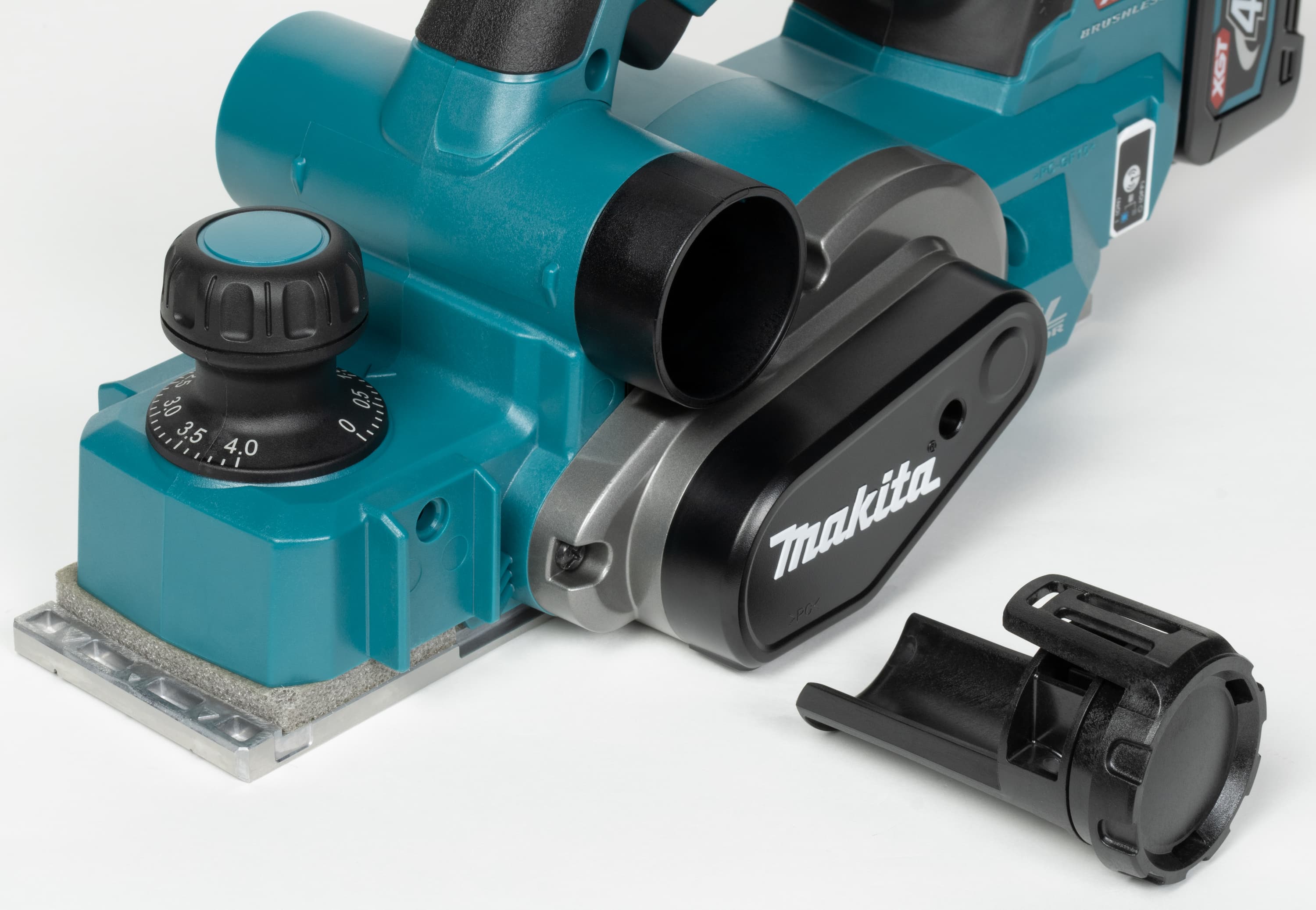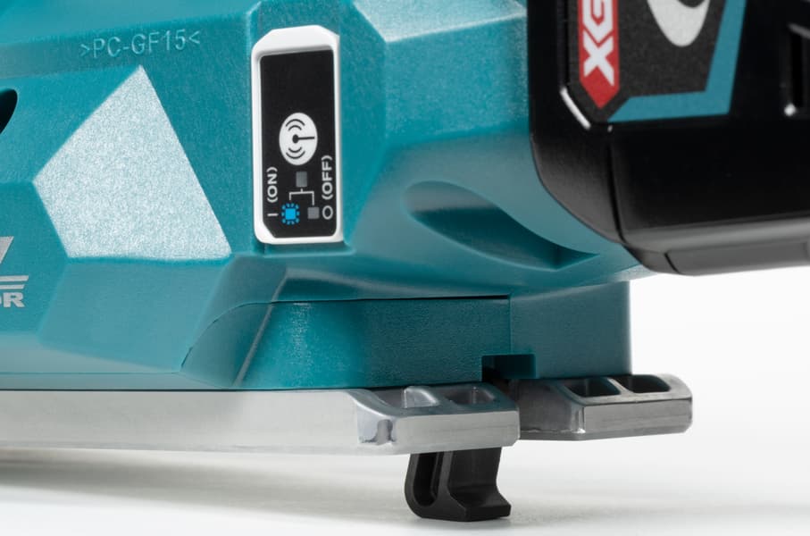 Кстати, к этим патрубкам можно подсоединить шланг пылесоса, что значительно снизит количество мусора вокруг рабочего места и уменьшит вероятность попадания мелкой взвеси в дыхательные пути. А уж если работа ведется в помещении, тут без пылесоса вообще никак. Причем пылесос желателен не обычный, а умный. Который умеет включаться одновременно с рубанком. Такое удобство обеспечивается технологией Makita AWS. Технология реализована в нескольких моделях пылесосов Makita, а для связи рубанка с пылесосом потребуется дополнительный аксессуар, Bluetooth-адаптер WUT01, который вставляется в слот под панелью управления беспроводным модулем.