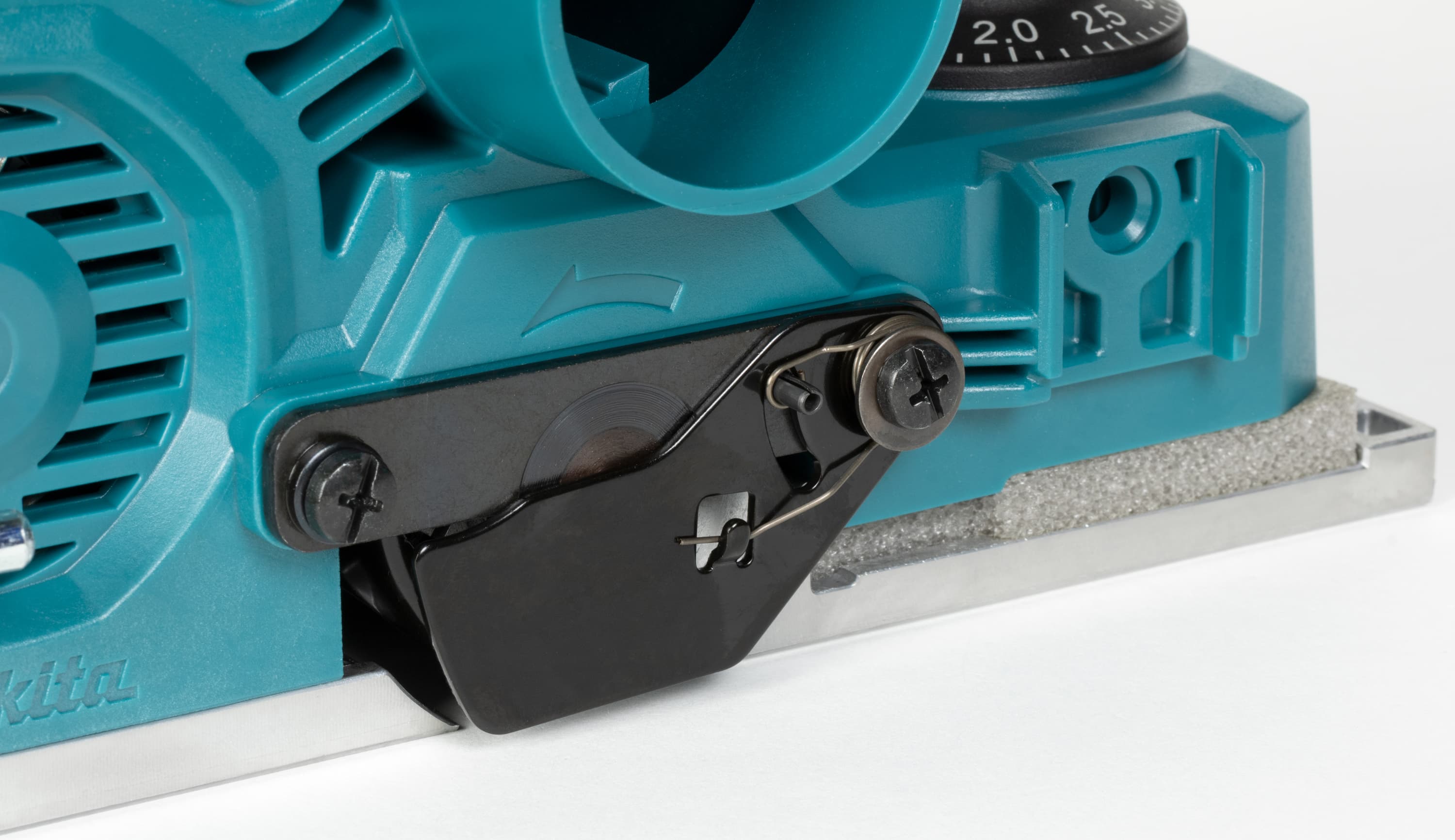 Впрочем, рассматриваемый рубанок все же имеет некоторые особенности, выгодно отличающие инструмент от прочих. Речь о безопасности. Точнее, о способах и приспособлениях, которые повышают безопасность работы. Например, такое на удивление элементарное, но действенное приспособление: подпружиненный язычок-опора. Если во время работы вы подняли рубанок над обрабатываемой поверхностью, то обратно рубанок встанет на поверхность не всей подошвой с ножами, а упрется в отскочившую опору. Это исключает риск повреждения ножей и заготовки. Лишь когда вы начнете движение рубанком, опора зайдет обратно внутрь задней части подошвы, и ножи войдут в контакт с древесиной плавно, а не рывком.