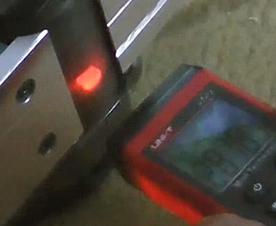 Выбор глубины строгания производится с учетом исходного качества обрабатываемой поверхности, твердости породы дерева, его влажности и множества прочих факторов. Но в любых случаях рекомендуется не лезть на рожон, сразу же выставляя максимальную глубину. Все равно желаемый результат вряд ли достигнешь первым проходом. Даже несмотря на вполне стандартную частоту оборотов вала с ножами, которая составляет около 14000 оборотов в минуту (цифры, которые можно видеть на следующем фото, требуется разделить пополам, ведь лазер фиксирует отражения от двух ножей).