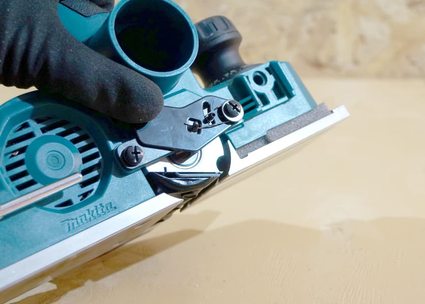 Неосведомленный пользователь может предположить, что глубина строгания регулируется положением ножа, как в древних ручных рубанках. Это не так. В электрорубанках используется другой метод. Вал с ножами всегда фиксирован относительно корпуса, меняется лишь высота передней части подошвы. В результате получается этакая лесенка с ножами. Чем передняя ступенька выше — тем глубже рубанок вгрызается в дерево.