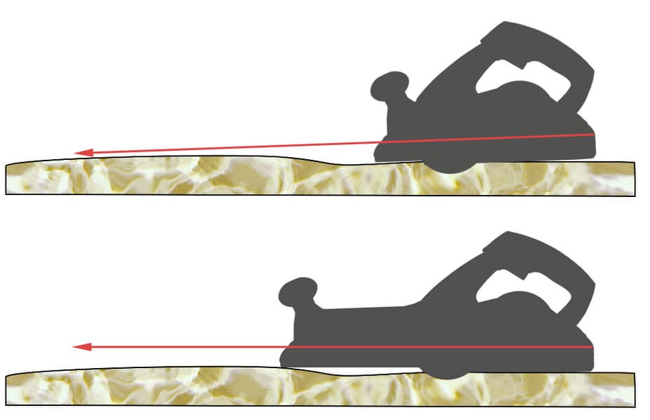 В процессе работы из-за формы фаски и ее малой высоты рубанок упирается даже в небольшое возвышение. Если на пути рубанка попадается сучок и другие неровности, переднюю часть инструмента приходится приподнимать, чтобы пройти этот участок.