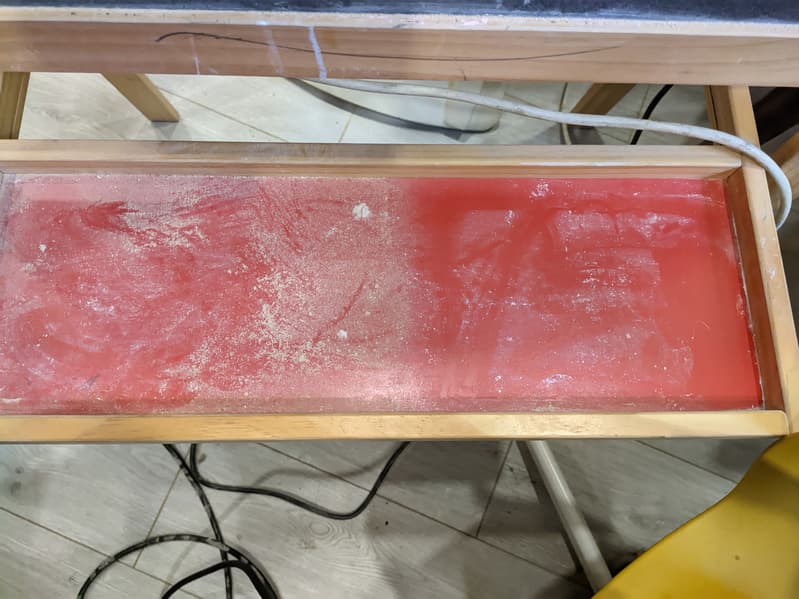Проверим, насколько хорошо справится с этой задачей наша воздуходувка. Для теста мы воспользовались шлифовальной машинкой и как следует запылили помещение. Вот сколько пыли осело на ровной поверхности (деревянной столешнице).