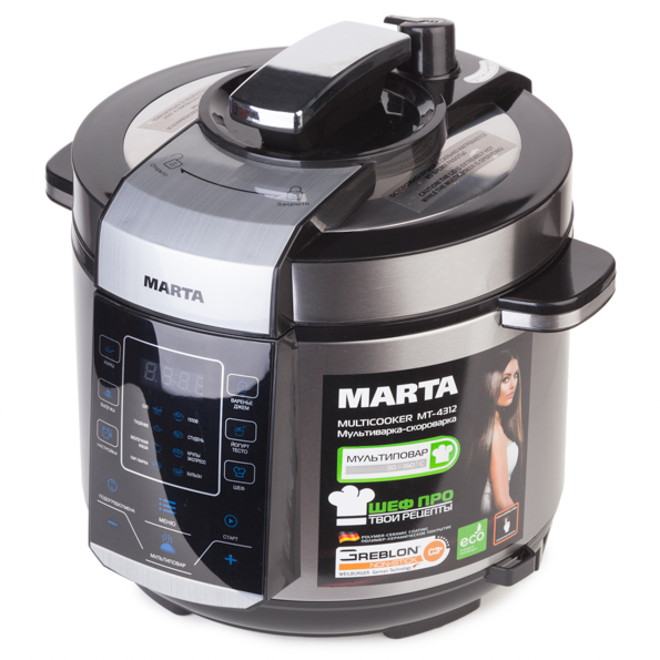 Мультиварка-скороварка Marta MT-4312 является по-настоящему универсальным прибором, как мы уже описали в преамбуле. Собственно, один этот прибор может выполнять практически все наиболее востребованные на кухне процессы: варить, тушить, жарить и печь. В том числе — использовать низкотемпературную варку, готовить пищу на пару́ и под давлением. Все функции и возможности использования прибора подробно описаны в инструкции.