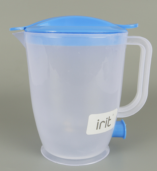 Эта модель скорее напоминает небольшой пластиковый кувшин с ручкой и съемной крышкой. Полупрозрачный термостойкий пластик позволяет хорошо видеть уровень воды, а на стенку нанесены пределы минимального и максимального объема. Логика примерно такая же: нагревательный прибор должен оставаться полностью под водой, вода не должна подниматься выше уровня носика. Штекер для шнура и крышка выкрашены в синий цвет.