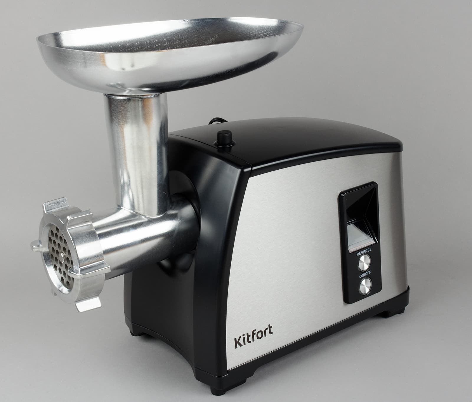 Kitfort KT-2105 — это прибор внушительных габаритов и веса, со строгим дизайном, с большим диаметром шнекового блока и загрузочного отверстия, толстыми и тяжелыми решетками и большим ножом. Нож и решетки, разумеется, стальные, хорошо отполированные, с едва заметными следами обработки. В комплекте с мясорубкой Kitfort KT-2105 идут три решетки: две с круглыми отверстиями диаметром 4 и 7 мм и одна — с большими трапециевидными отверстиями. Диаметр решеток — 68 мм, толщина — 7 мм.
